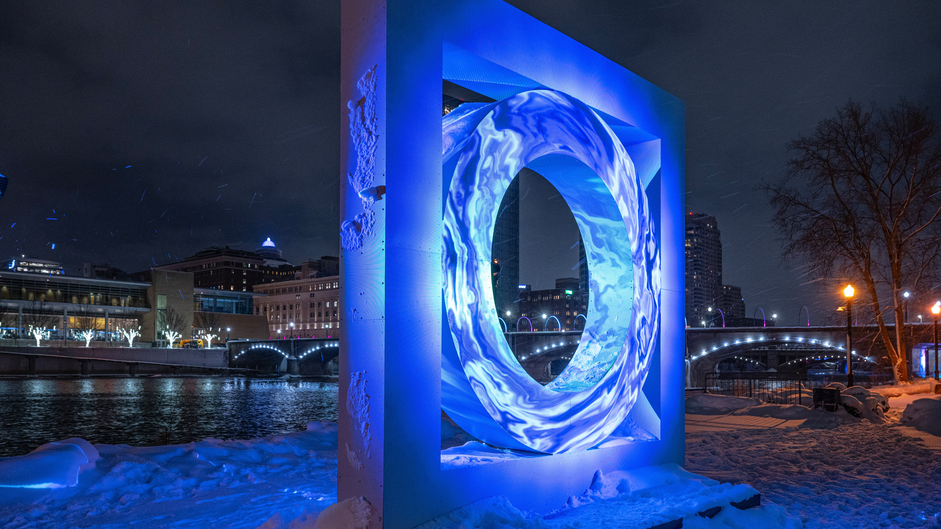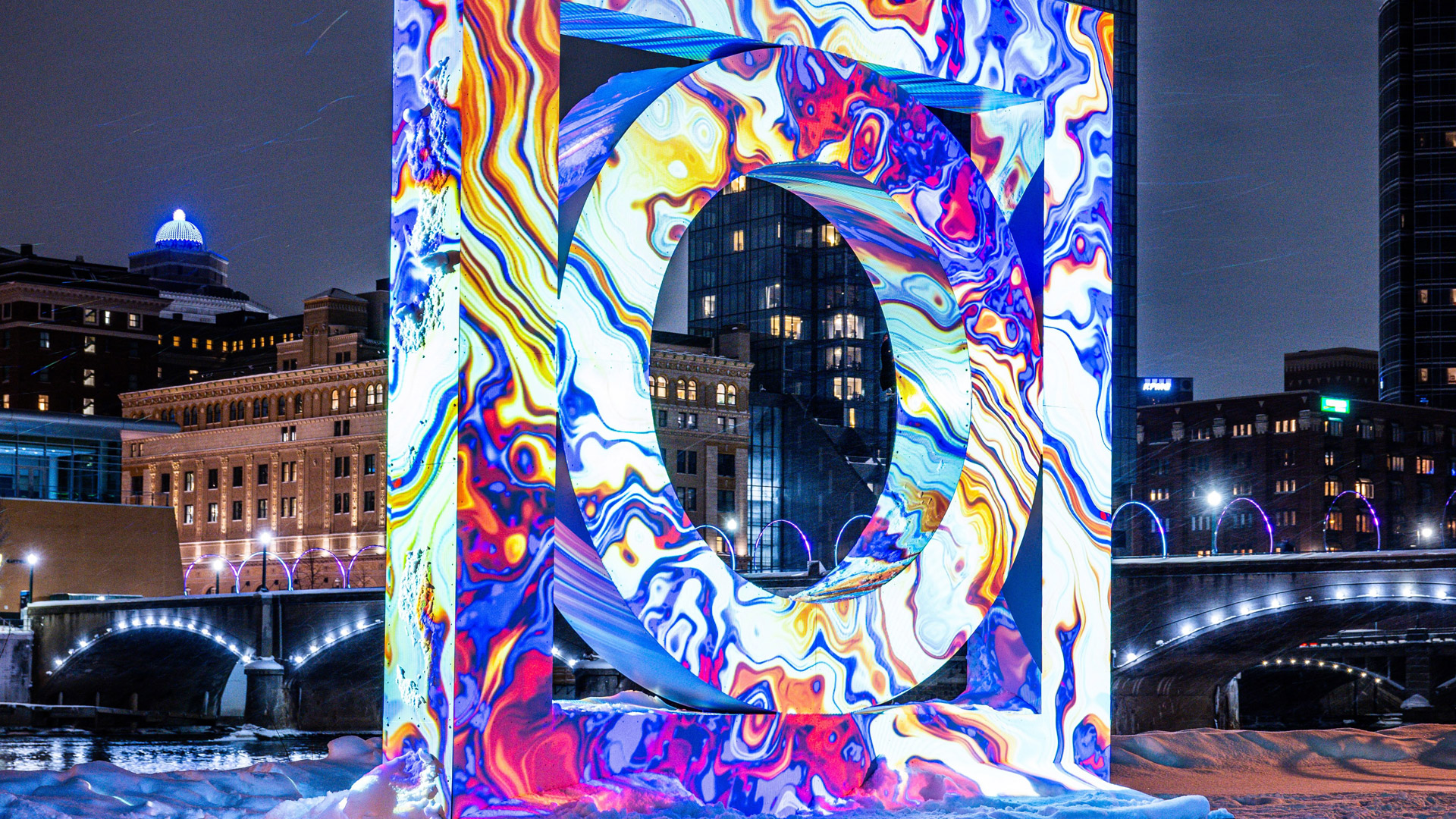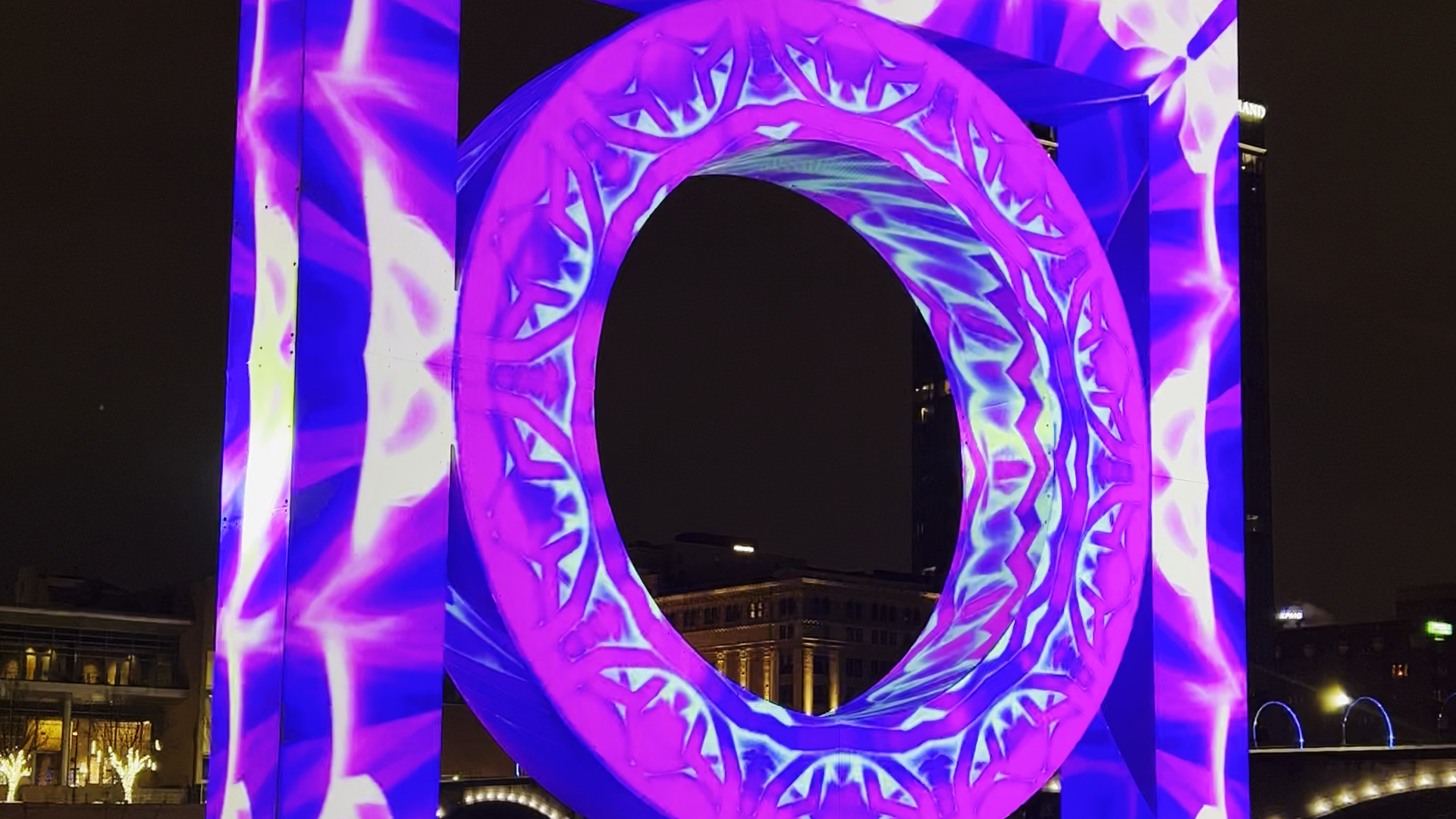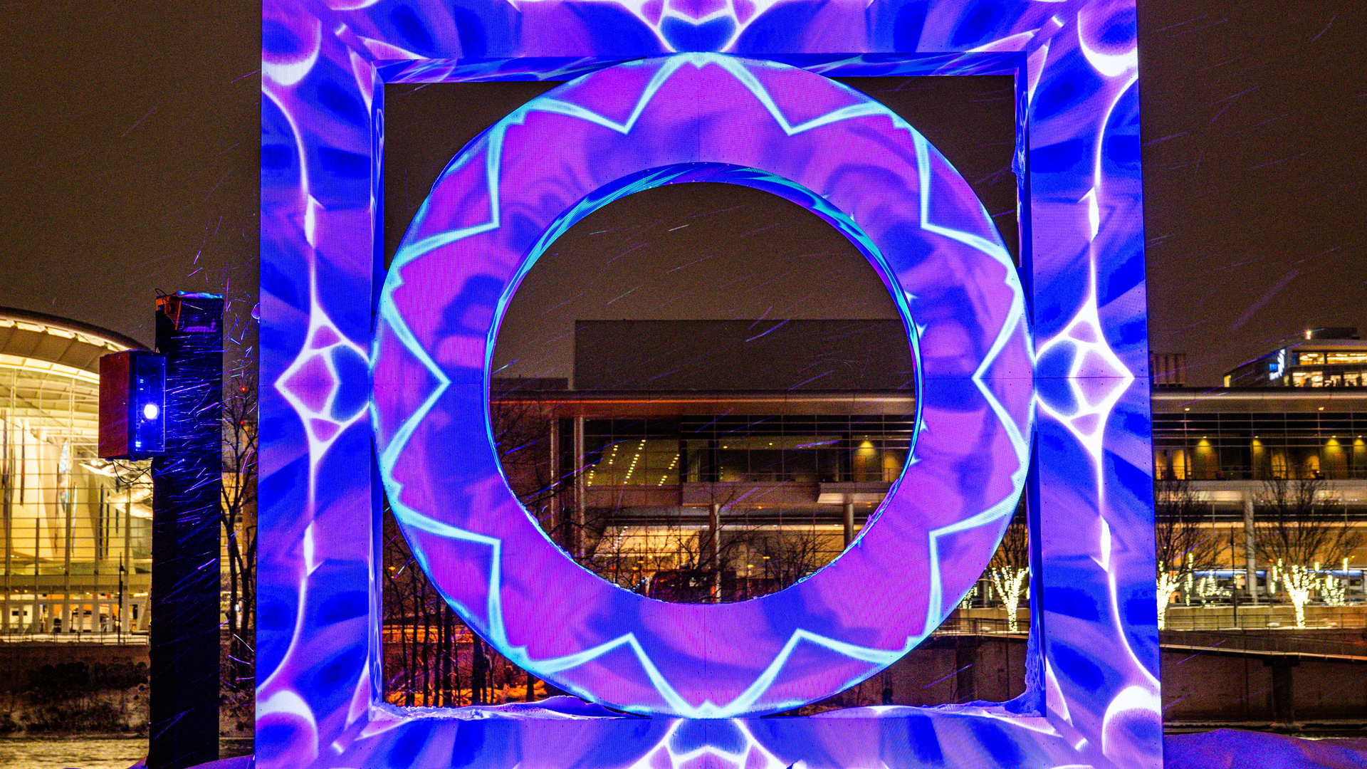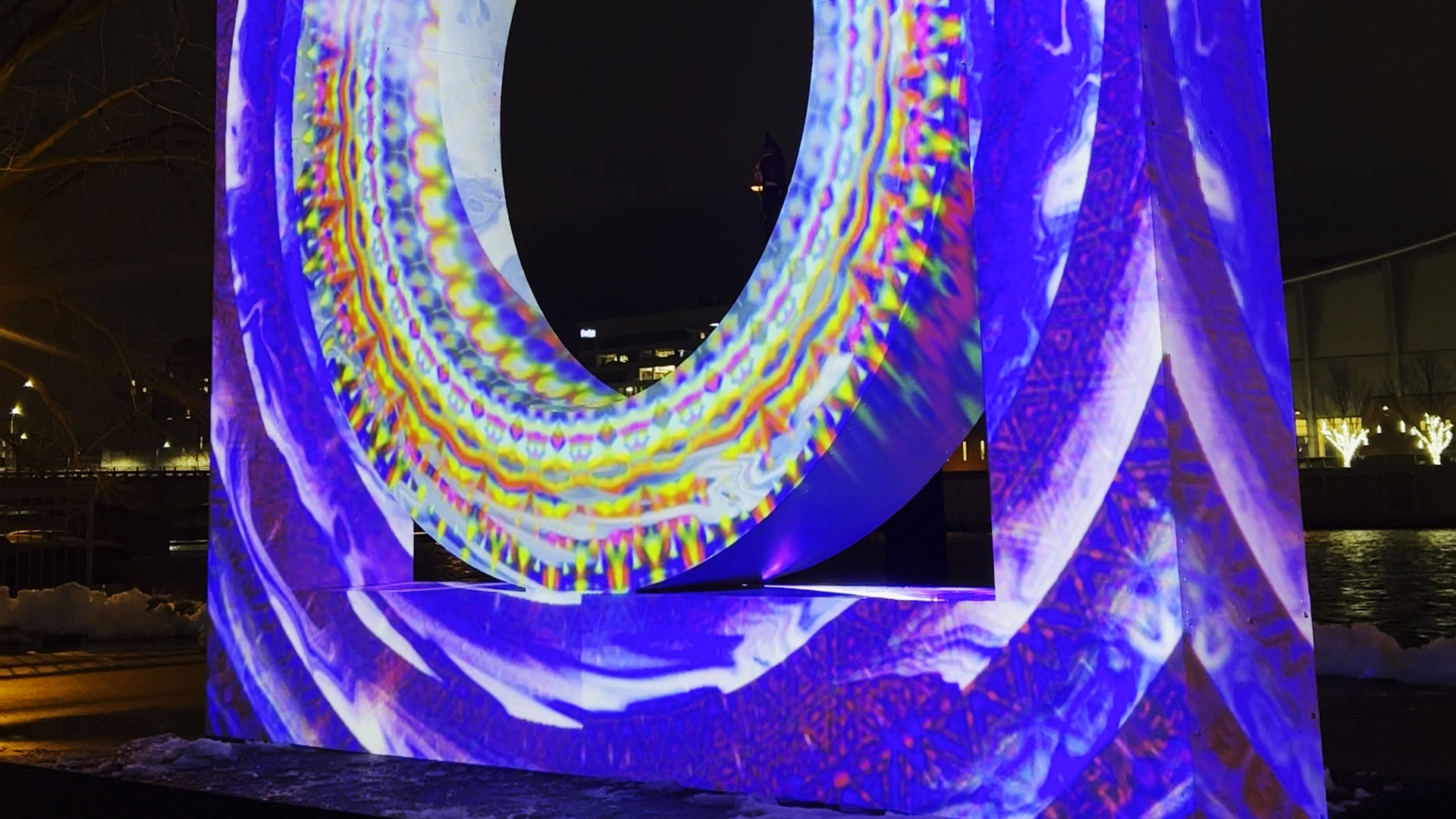 Stargate is an immersive projection sculpture. Featuring a 12-ft square encompassing a circular ring, this installation was designed as a portal to guide viewers on an awe-inspiring journey through the cosmos. Viewers are encouraged to climb into the central ring, serving as both a meditative space and a source of breathtaking photo opportunities, creating interactions and shared experiences among spectators. Hypnotic visuals seamlessly meld with an original contemplative soundtrack, creating an otherworldly portal where the audience is transported to the realm of the stars while standing firmly on Earth’s soil.