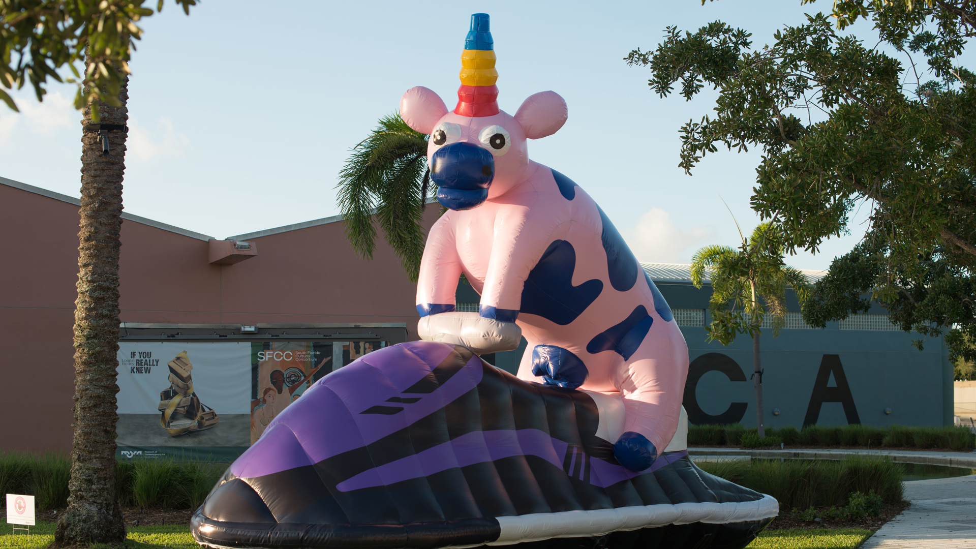 Artist duo LIZN’BOW — Liz Ferrer and Bow Ty — centers their practice on the absurd and fantastical, exploring class, culture, and gender identity. El Mundo es Mágico brings these themes to life with a larger-than-life inflatable unicorn cow on a jet ski that combines Miami reference points with their own personal fantasy universe. Using playful imagery, this project aligns with the artists' ethos of a more inclusive and feminist worldview.