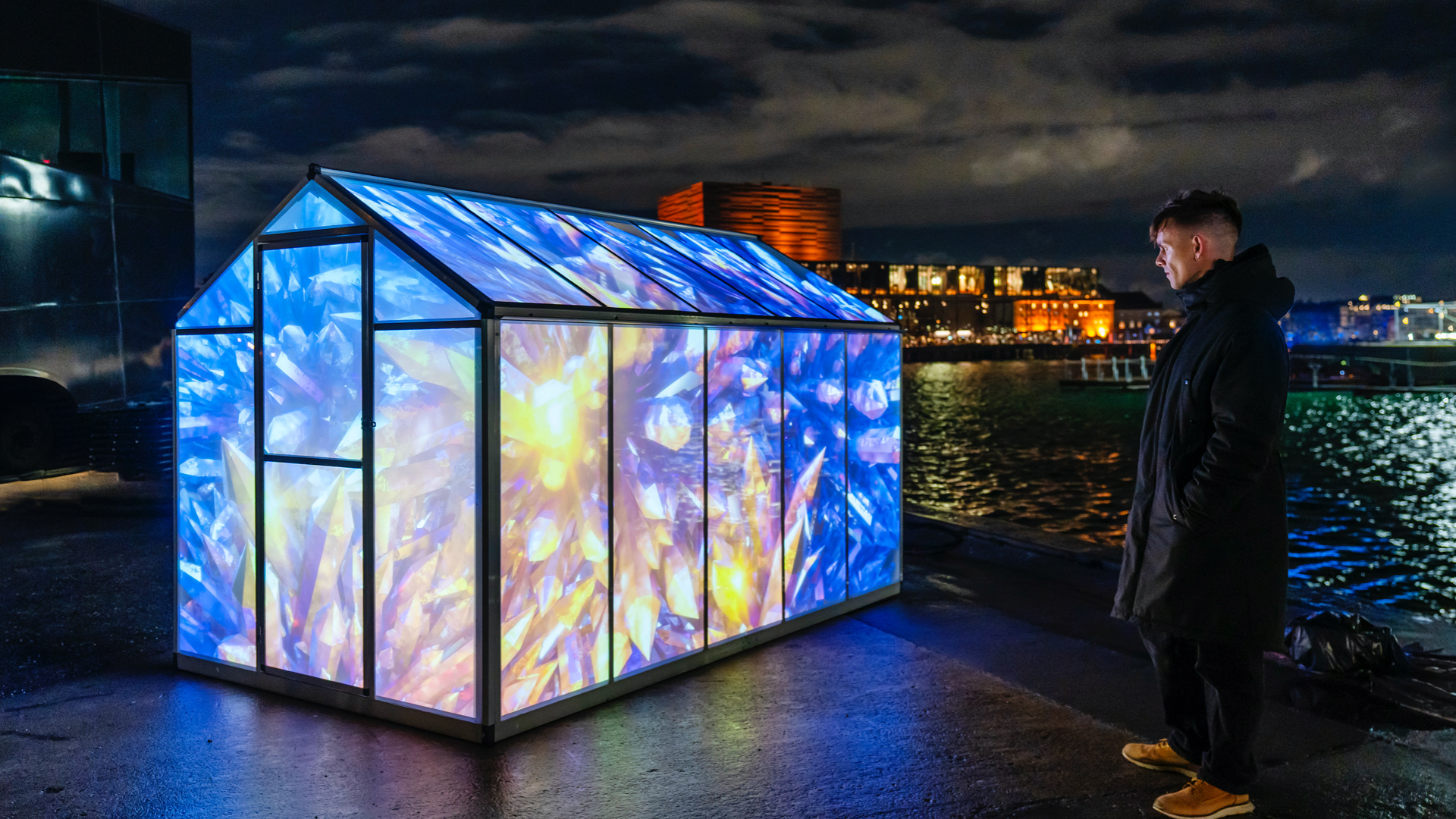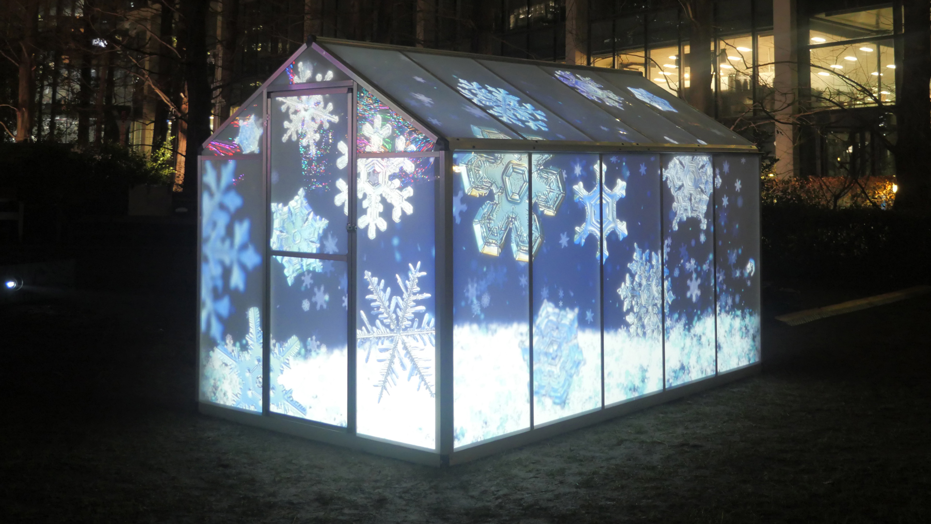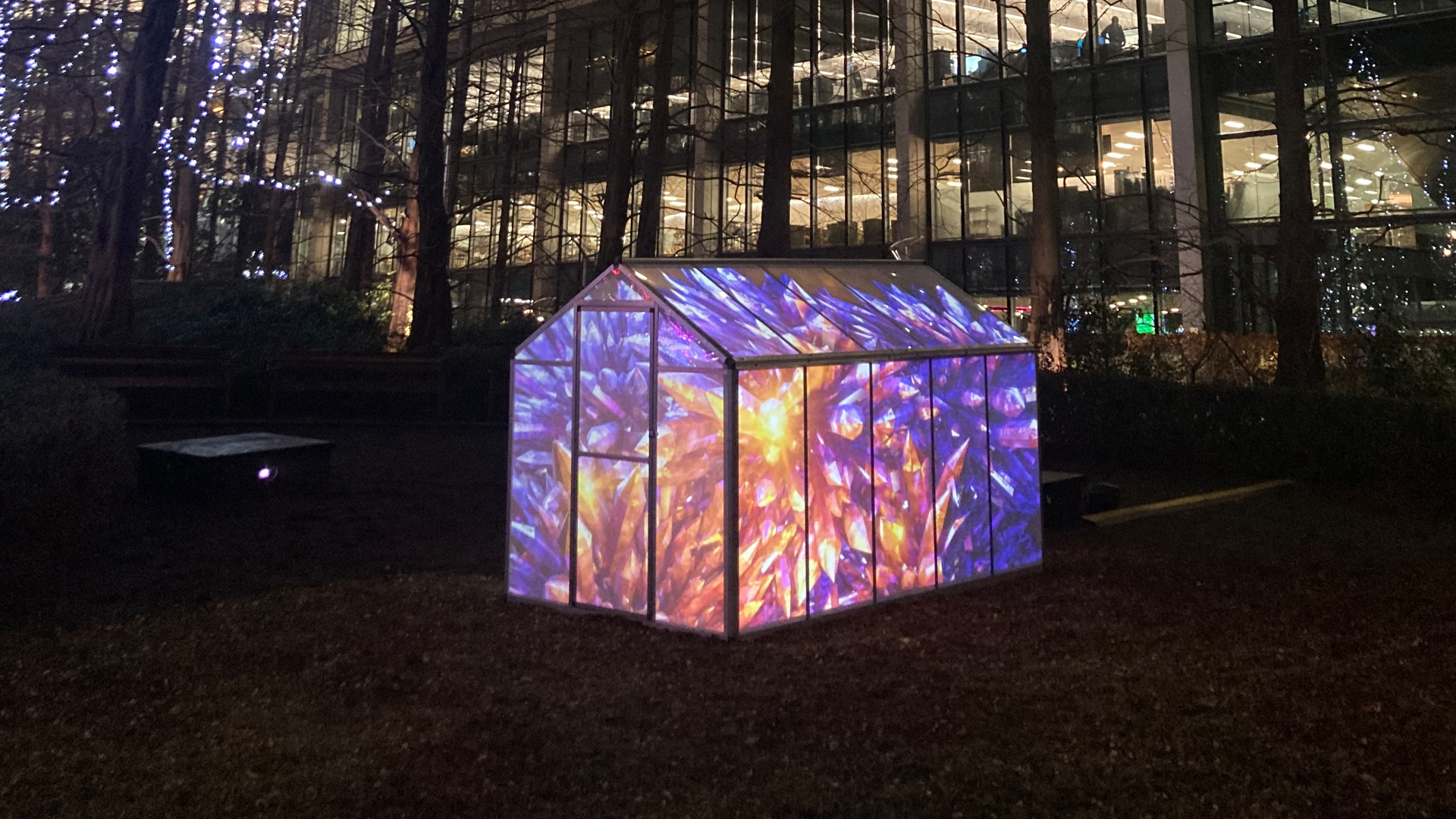 Crystal Greenhouse is a standard domestic greenhouse that Shared Space and Light have adapted to allow projections on three of its surfaces, which, when viewed from certain angles, gives the impression of breathtaking imagery and sound emanating from within.