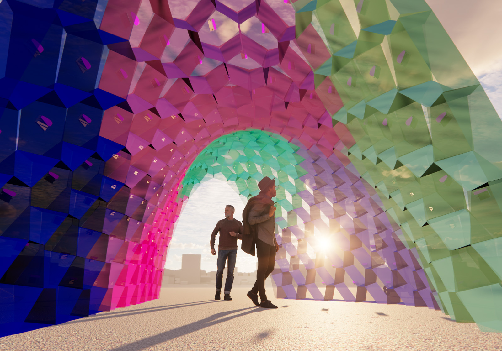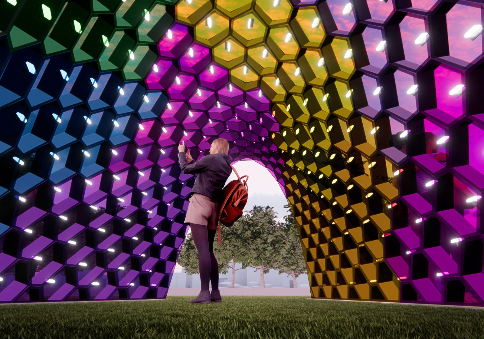 An enchanting honeycomb tunnel installation that awakens after nightfall, illuminating the surroundings with sustainable solar lights. This enchanting structure invites people to step inside and immerse themselves in a mesmerizing zero-energy consumption media facade composed of a multitude of solar lights. By day, as the sun's rays gracefully charge the lights, visitors are treated to a kaleidoscope of hexagonal colors and shades, all brought to life by the installation's recycled reflective materials.