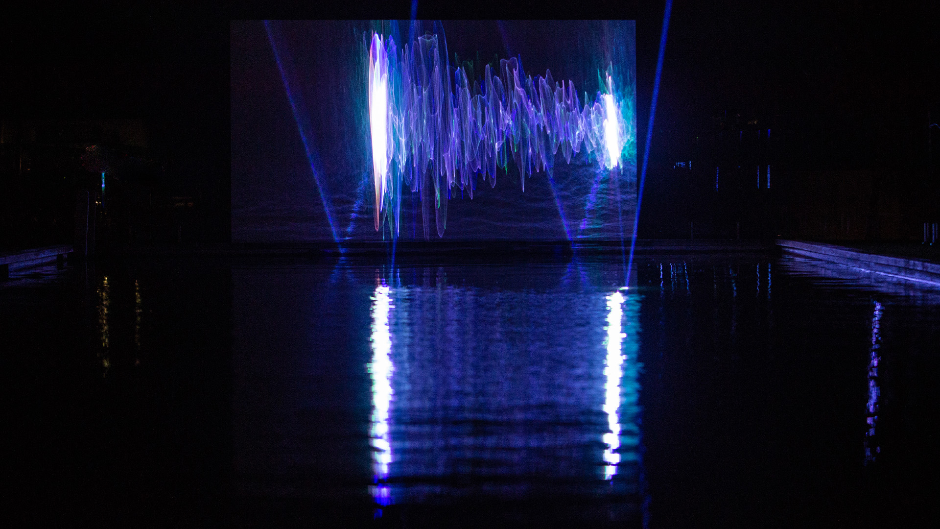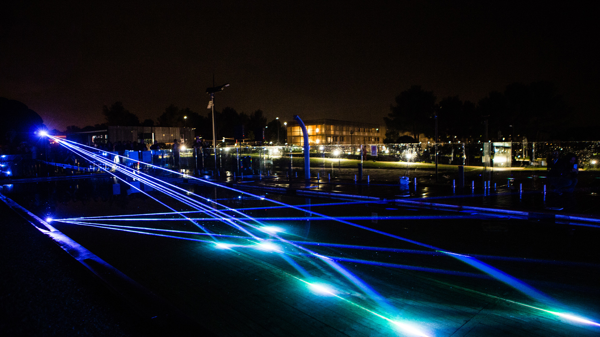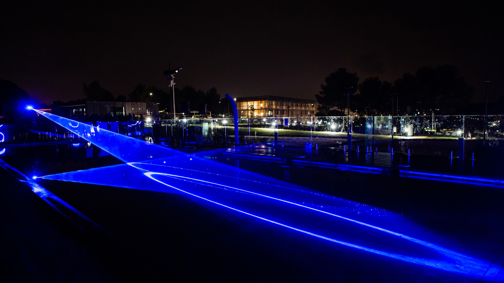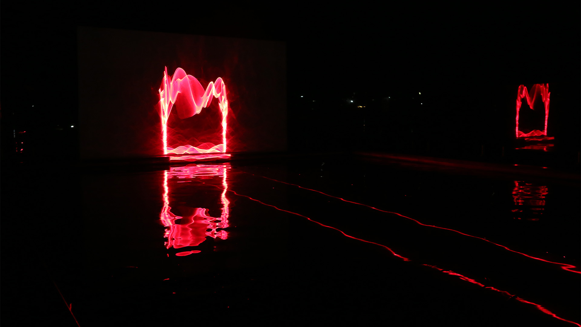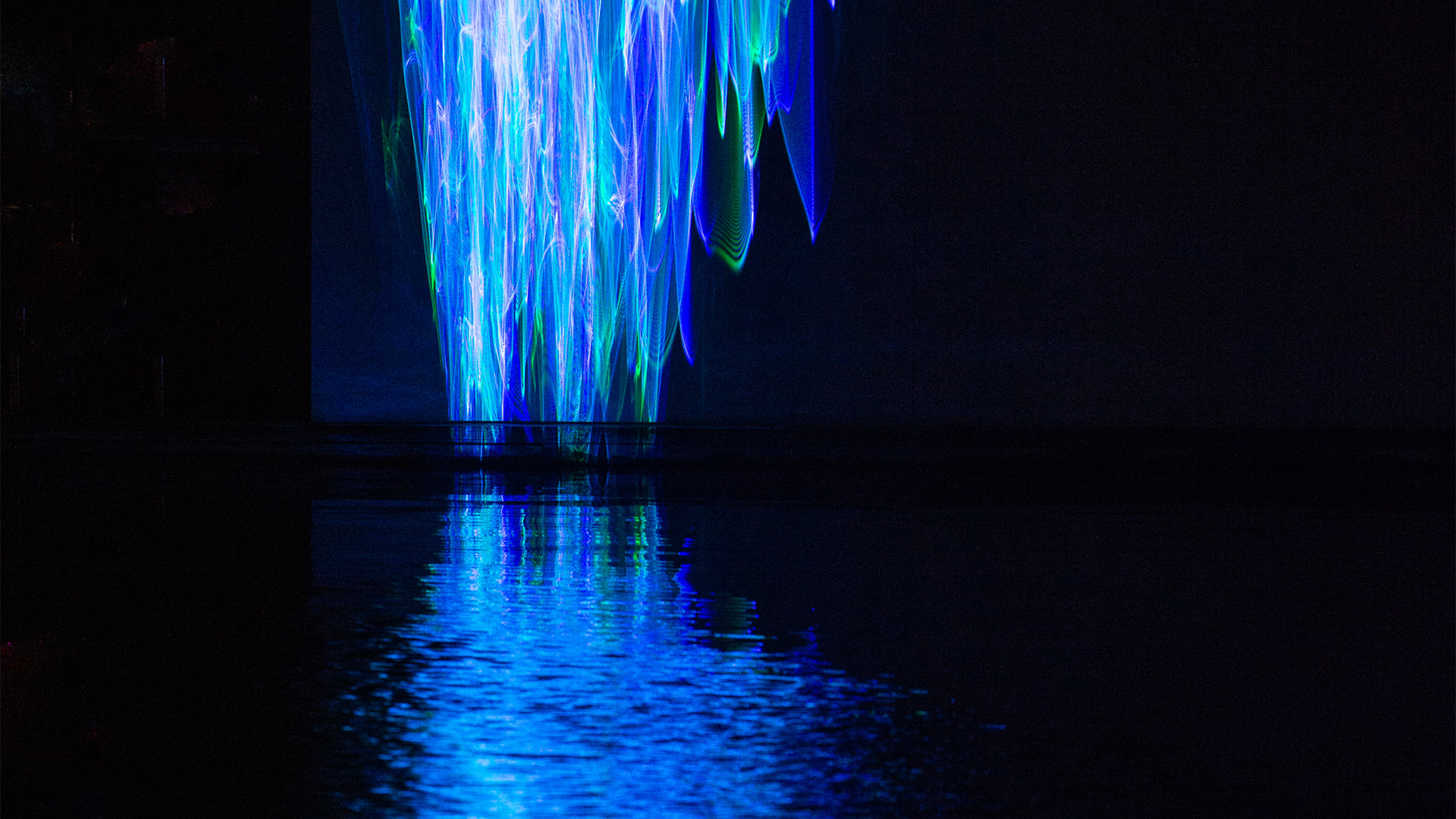 Created by the Montréal-based artists, "Laser Like Water" is a digital art installation intended as a meeting of various elements that together give rise to new perceptions of those same elements only possible as a result of their amalgamation. The piece is composed of brightly-colored lasers and shining ropes that slice through the air, fall apart upon contact with water, and then are reflected and deposited onto a mirrored screen. That ultimately results in the creation of new abstract forms, producing an intense experience - a connection and a synergy within a defined space.