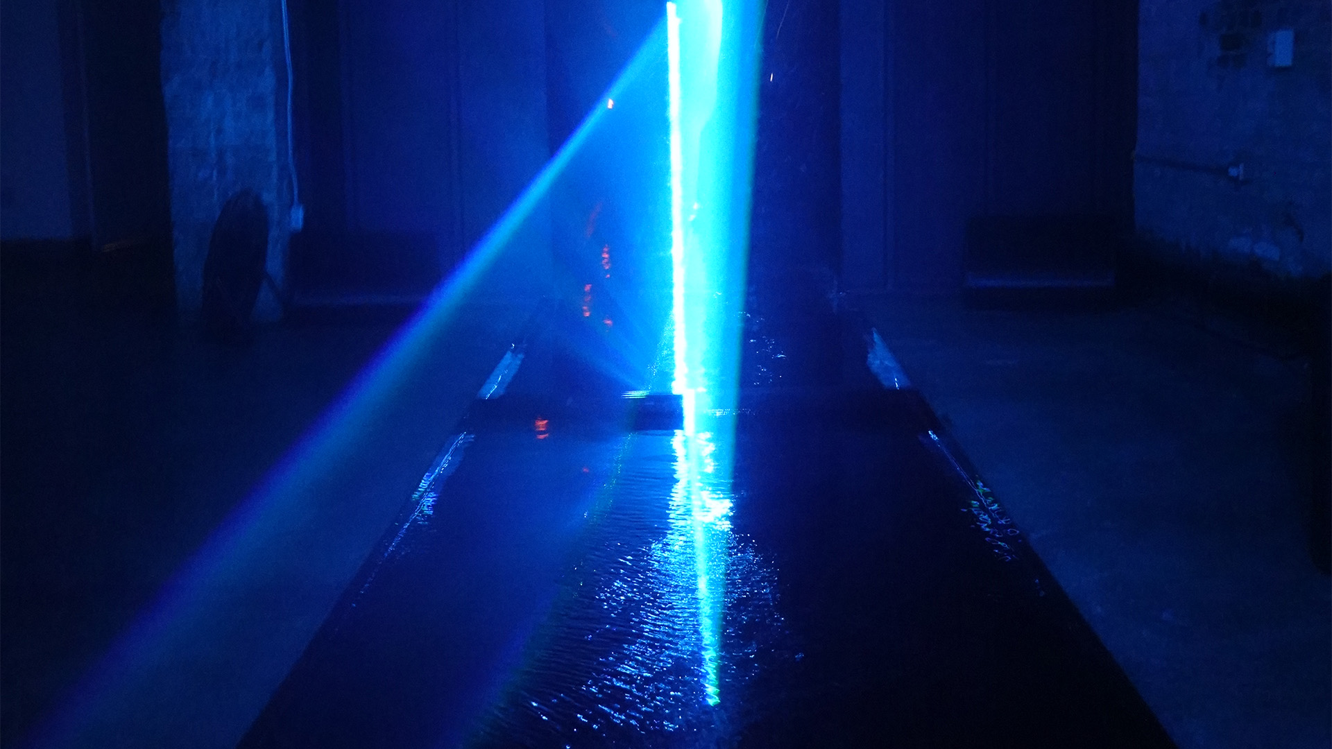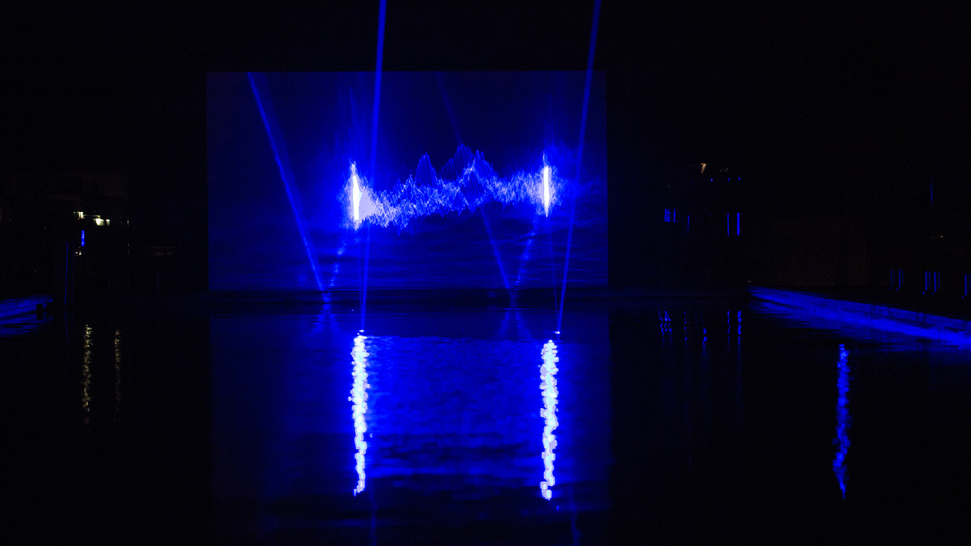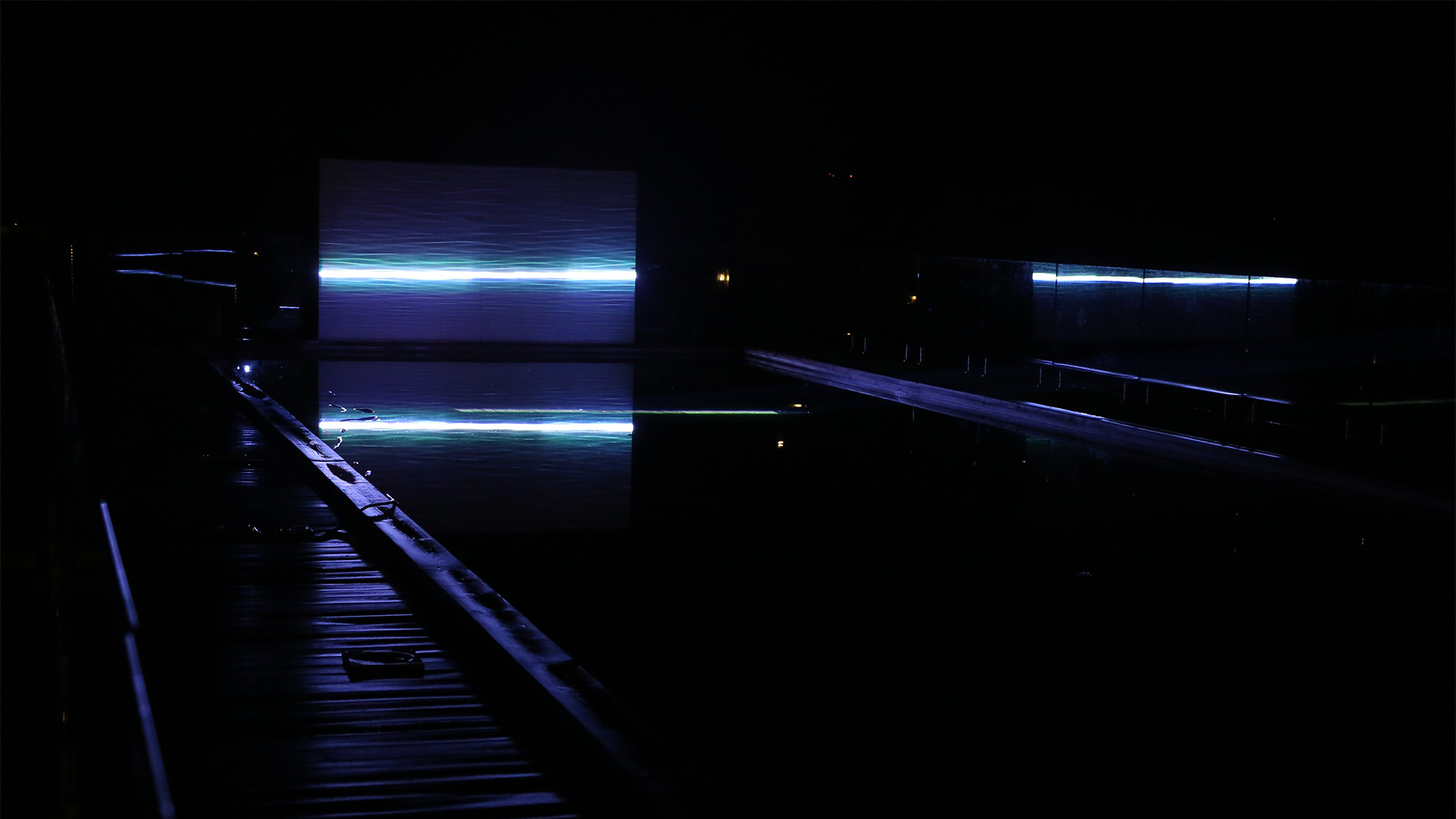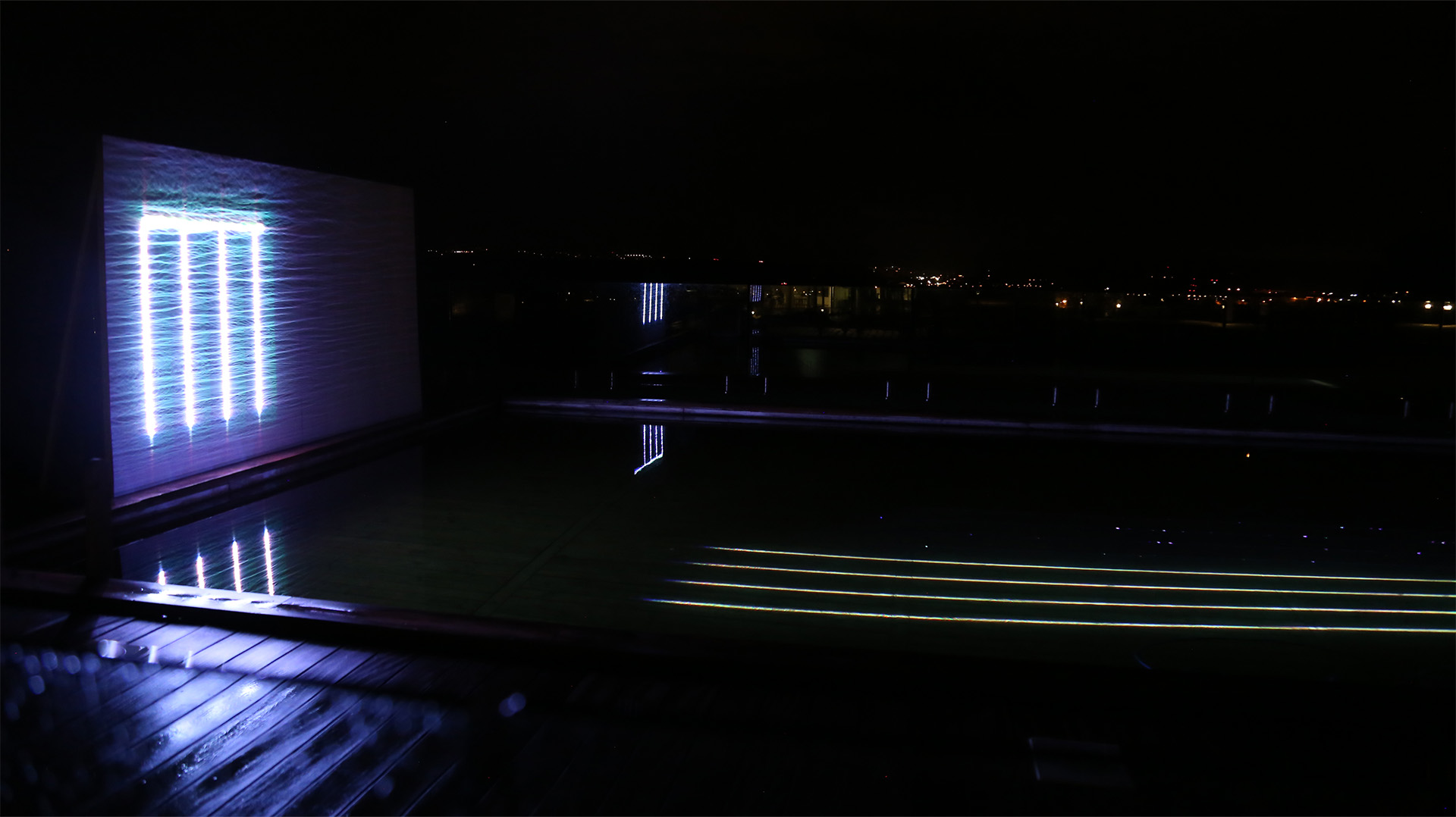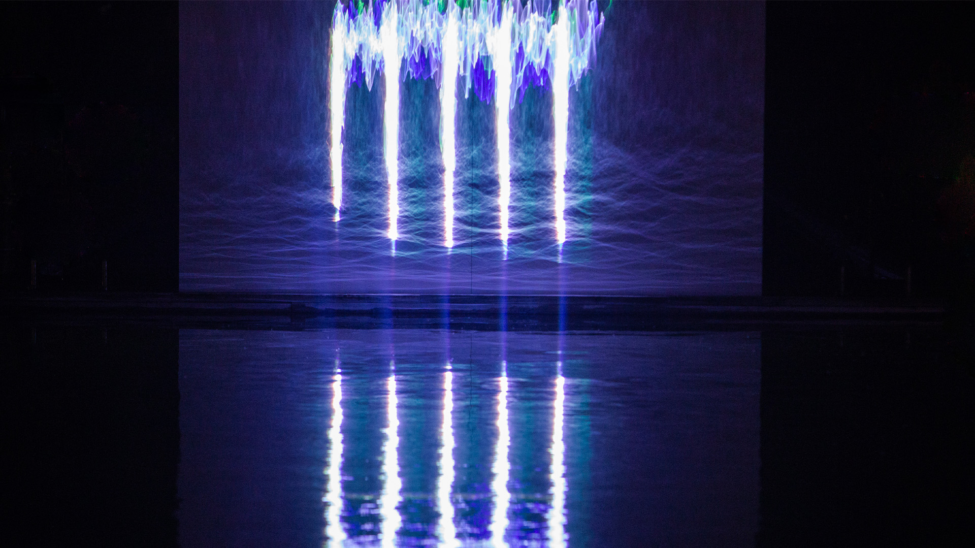 Created by the Montréal-based artists, "Laser Like Water" is a digital art installation intended as a meeting of various elements that together give rise to new perceptions of those same elements only possible as a result of their amalgamation. The piece is composed of brightly-colored lasers and shining ropes that slice through the air, fall apart upon contact with water, and then are reflected and deposited onto a mirrored screen. That ultimately results in the creation of new abstract forms, producing an intense experience - a connection and a synergy within a defined space.