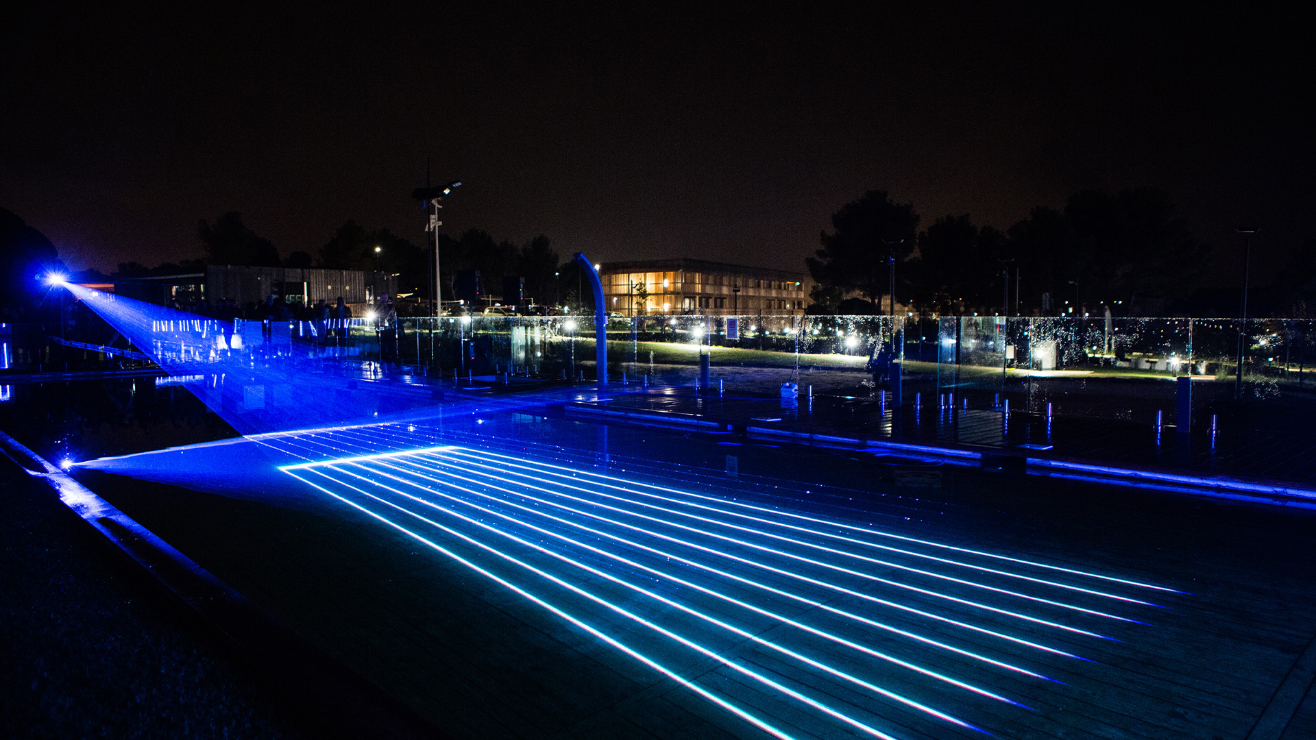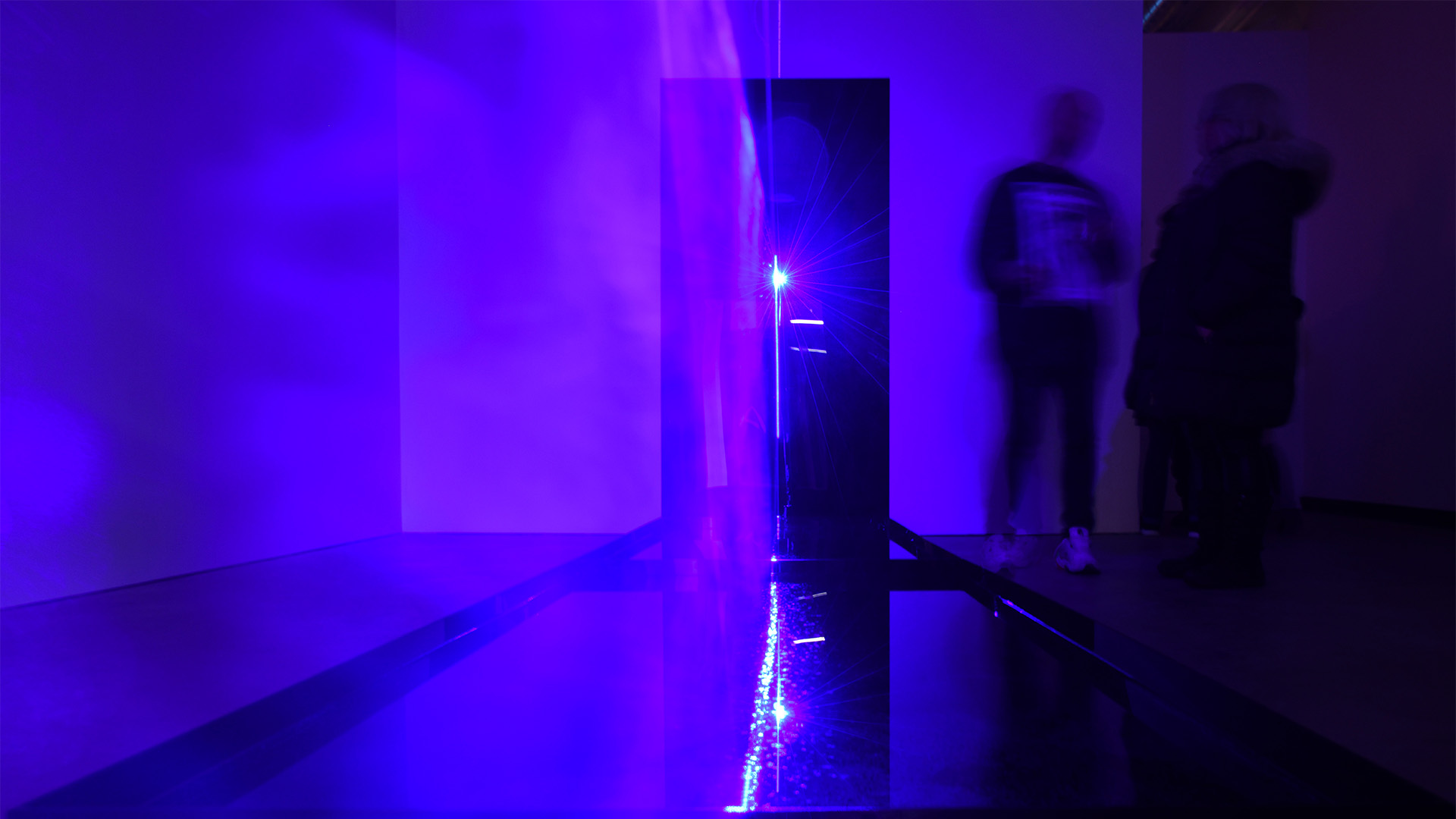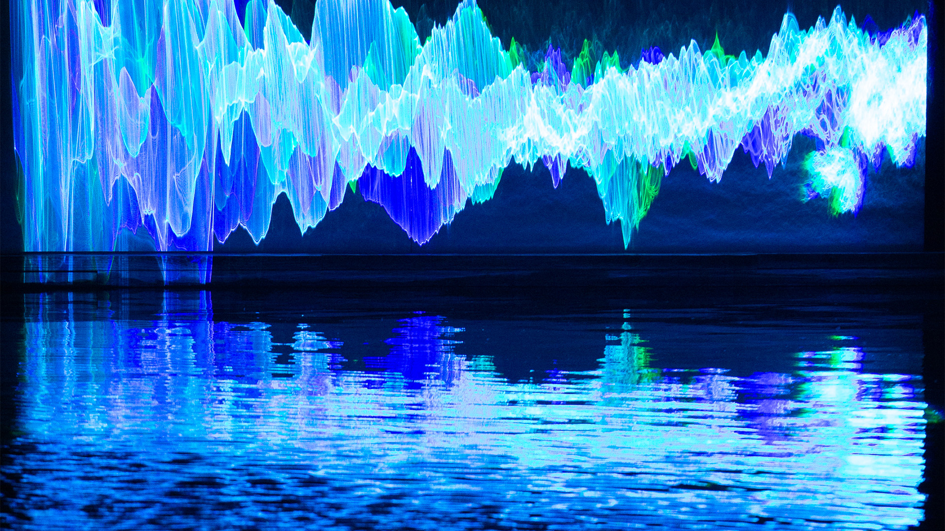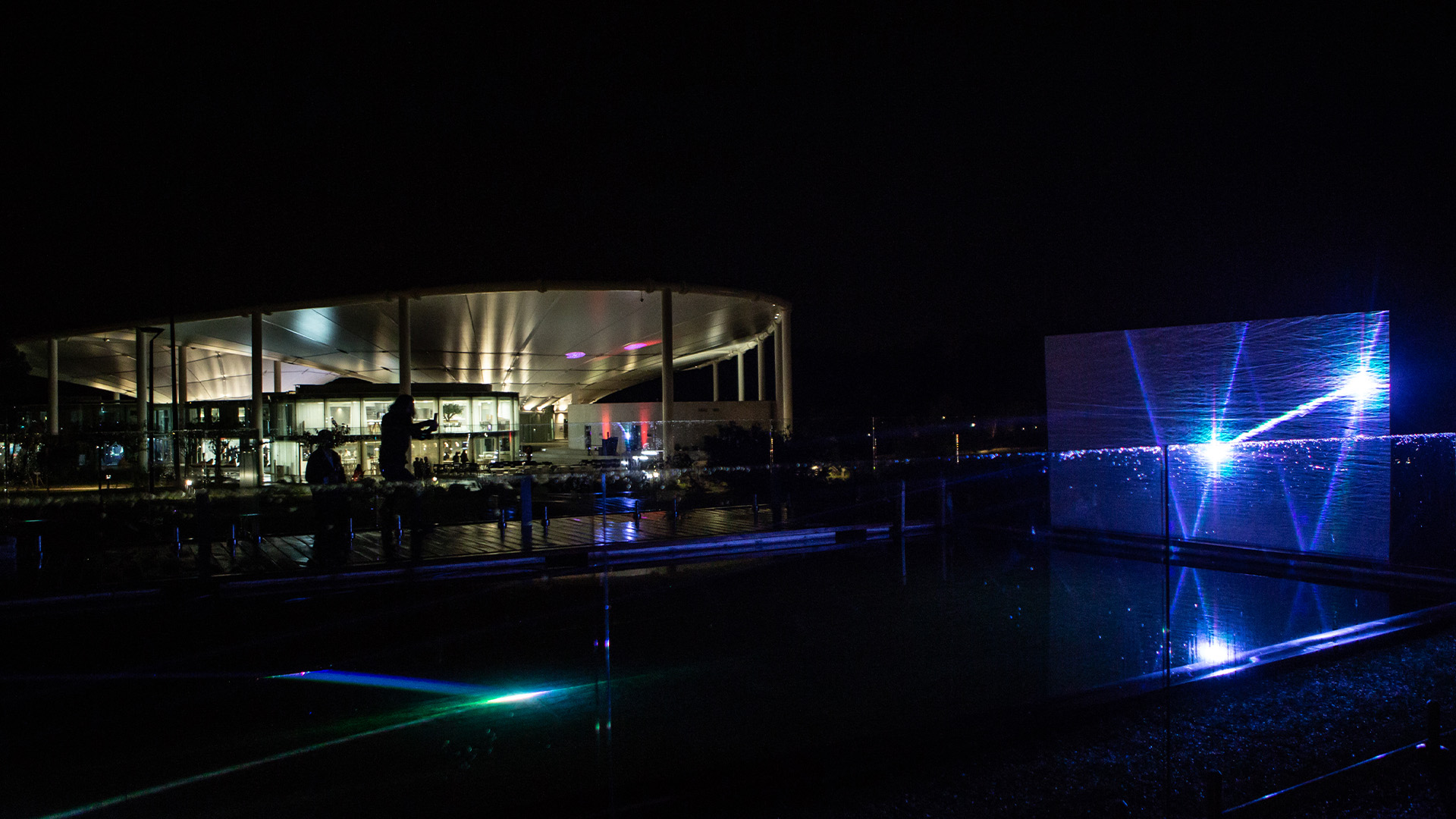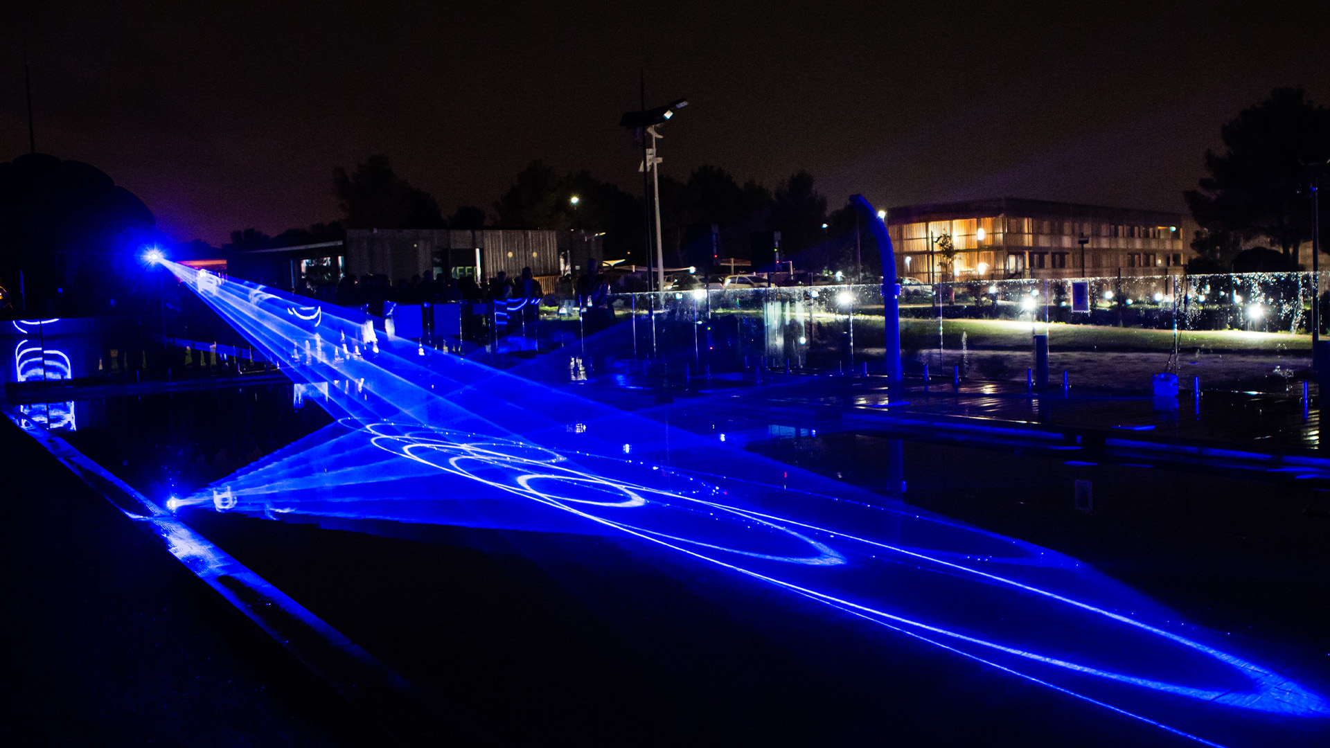 Created by the Montréal-based artists, "Laser Like Water" is a digital art installation intended as a meeting of various elements that together give rise to new perceptions of those same elements only possible as a result of their amalgamation. The piece is composed of brightly-colored lasers and shining ropes that slice through the air, fall apart upon contact with water, and then are reflected and deposited onto a mirrored screen. That ultimately results in the creation of new abstract forms, producing an intense experience - a connection and a synergy within a defined space.