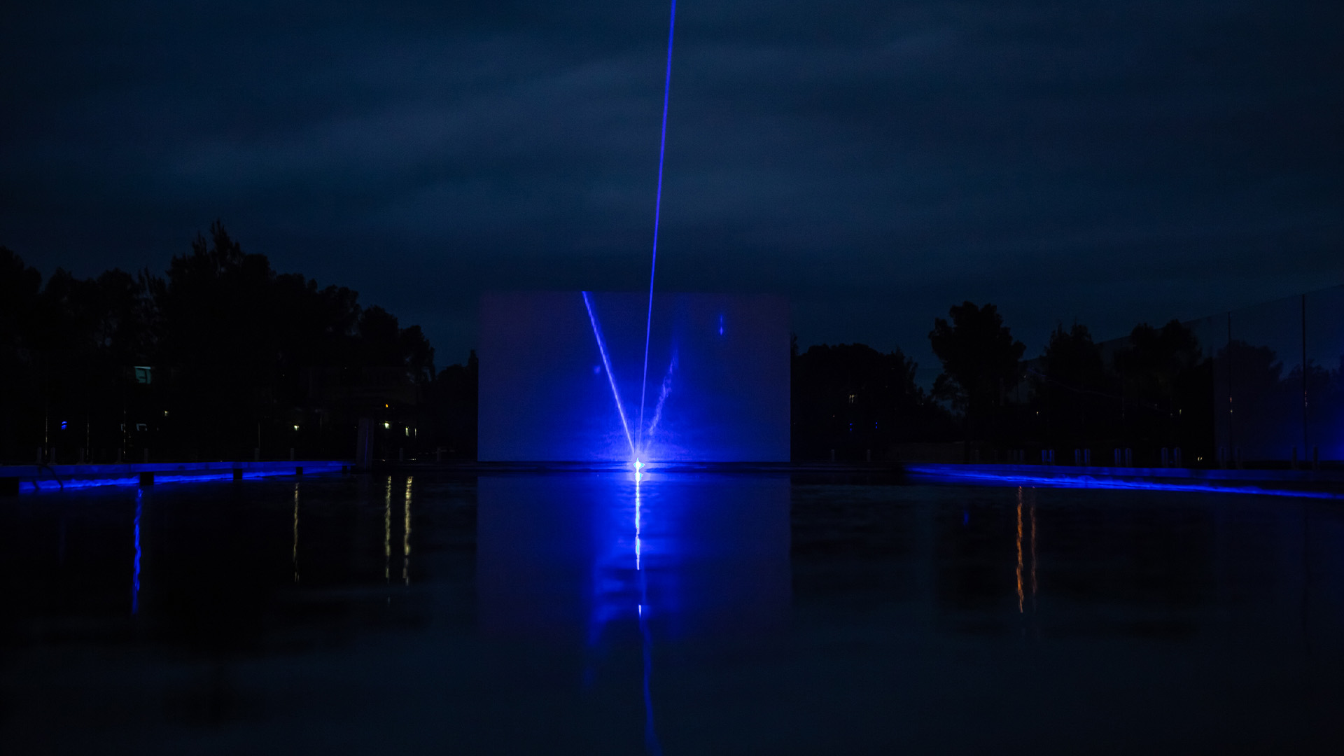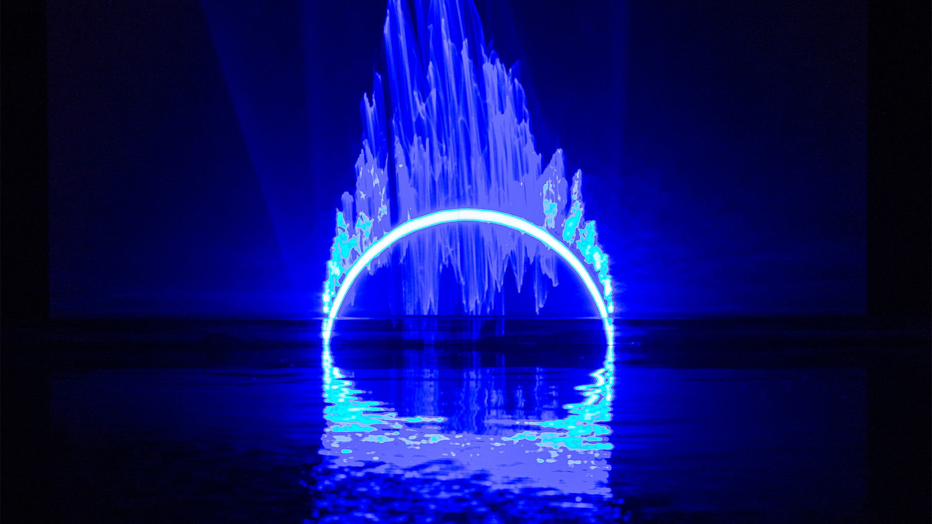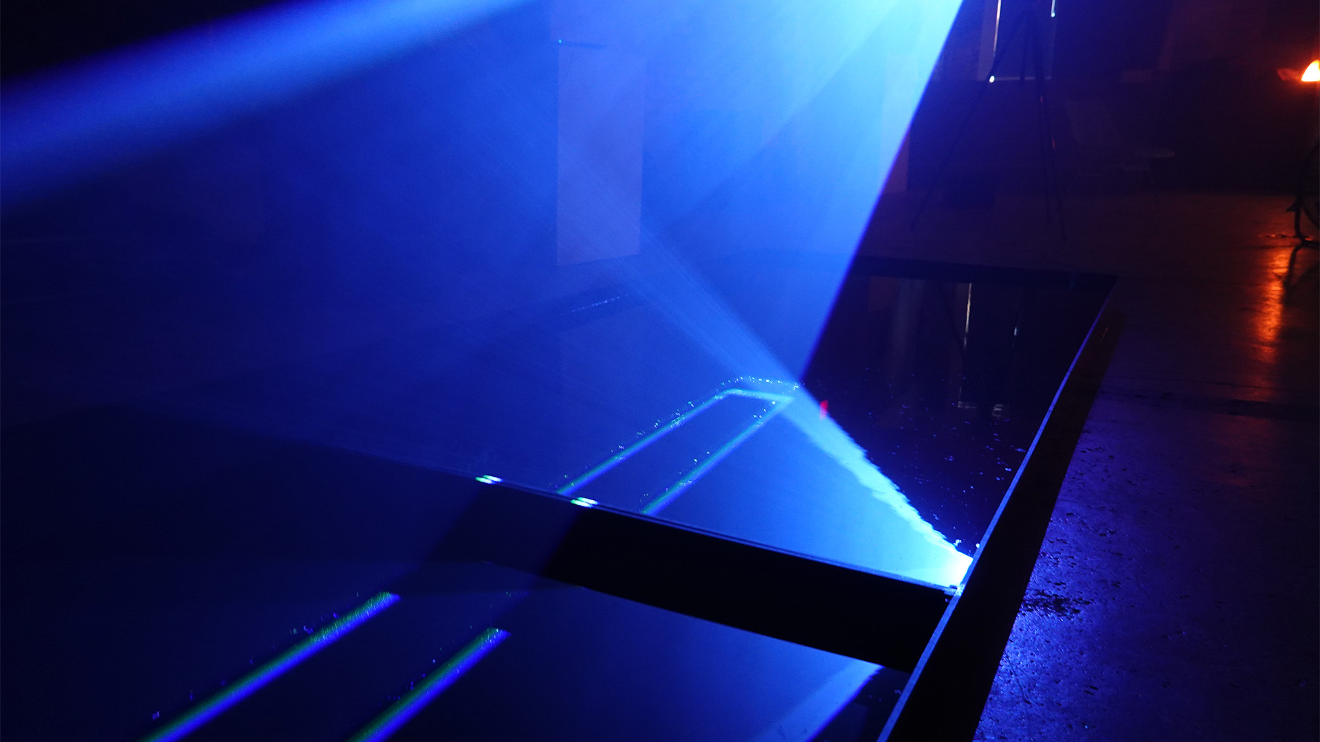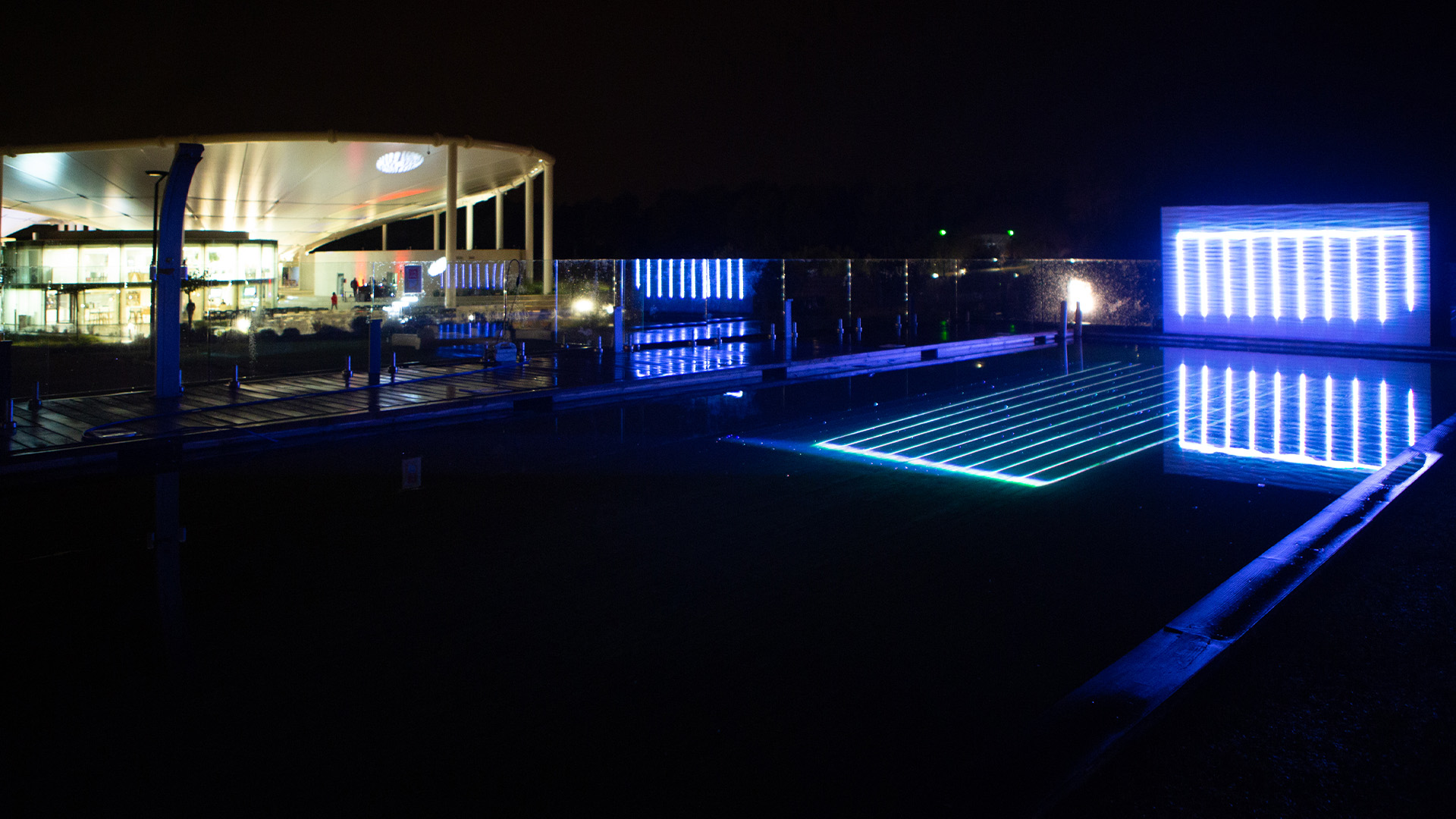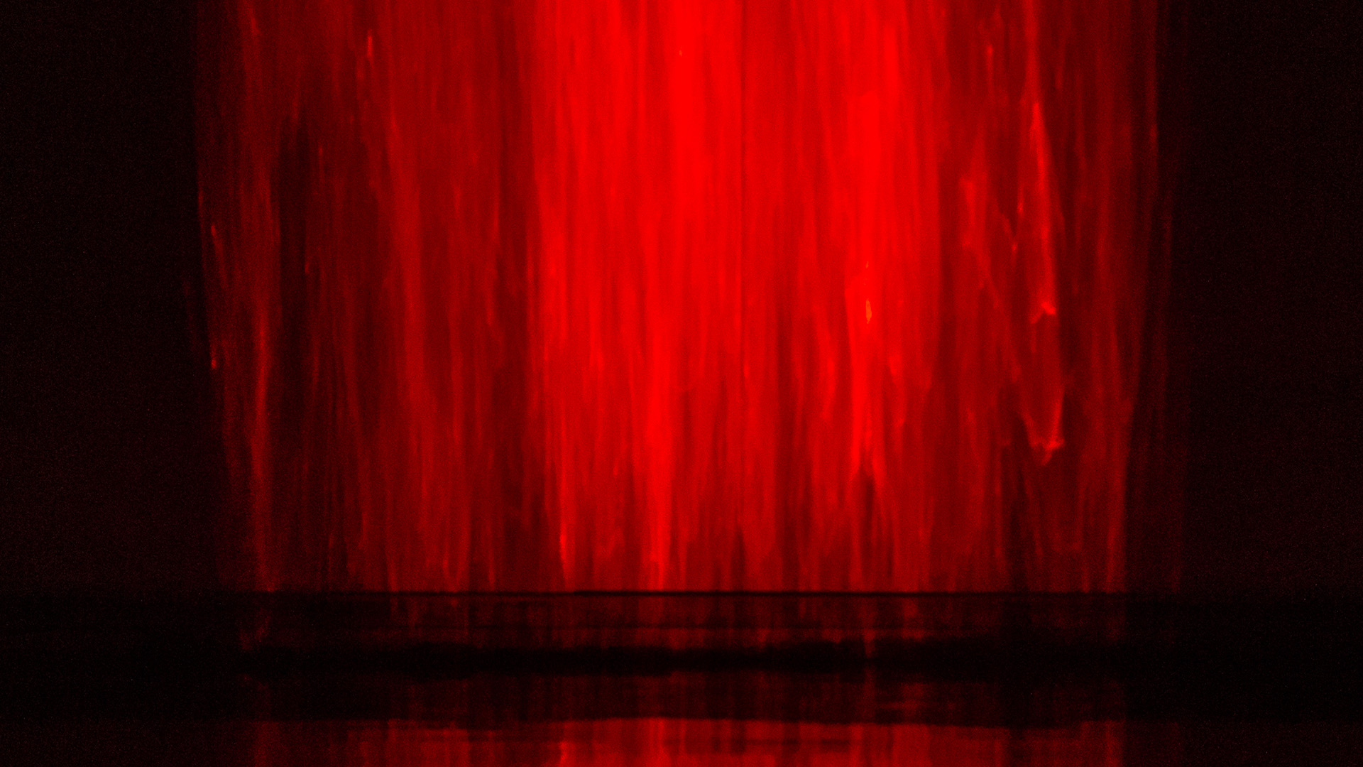 Created by the Montréal-based artists, "Laser Like Water" is a digital art installation intended as a meeting of various elements that together give rise to new perceptions of those same elements only possible as a result of their amalgamation. The piece is composed of brightly-colored lasers and shining ropes that slice through the air, fall apart upon contact with water, and then are reflected and deposited onto a mirrored screen. That ultimately results in the creation of new abstract forms, producing an intense experience - a connection and a synergy within a defined space.
