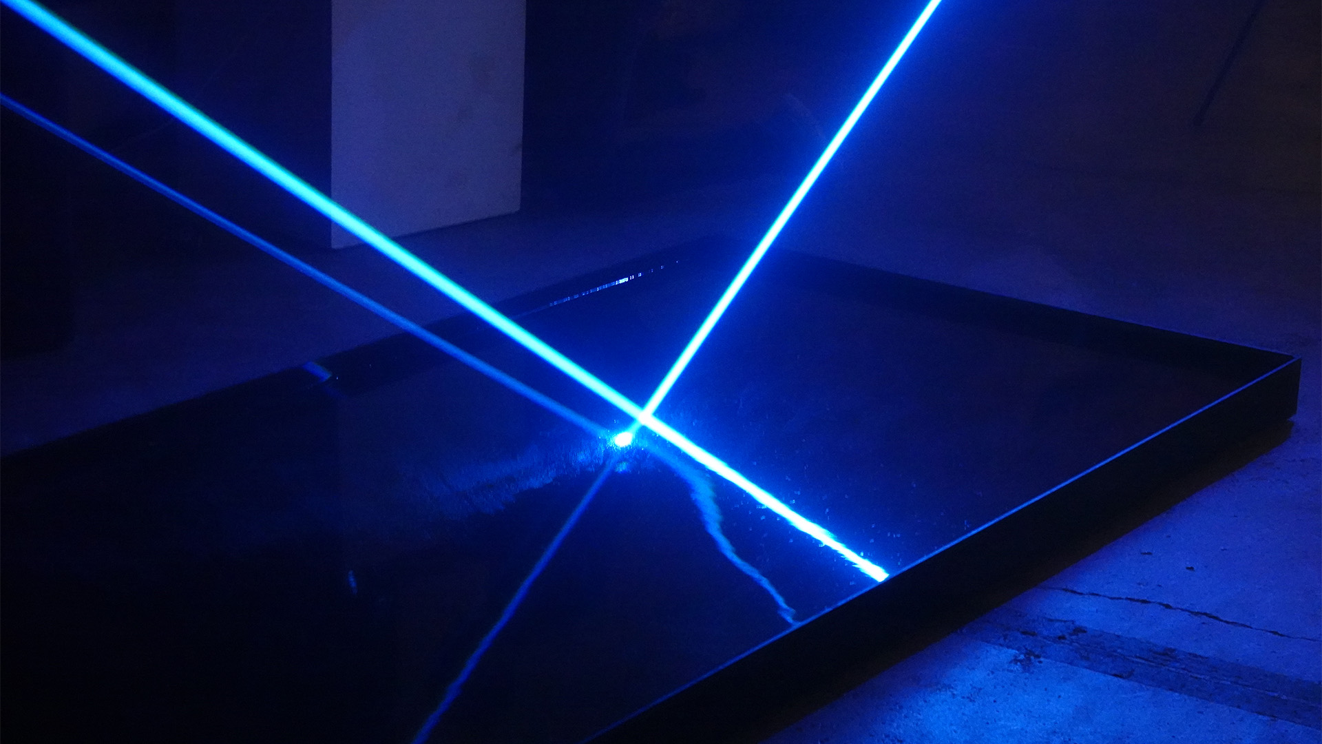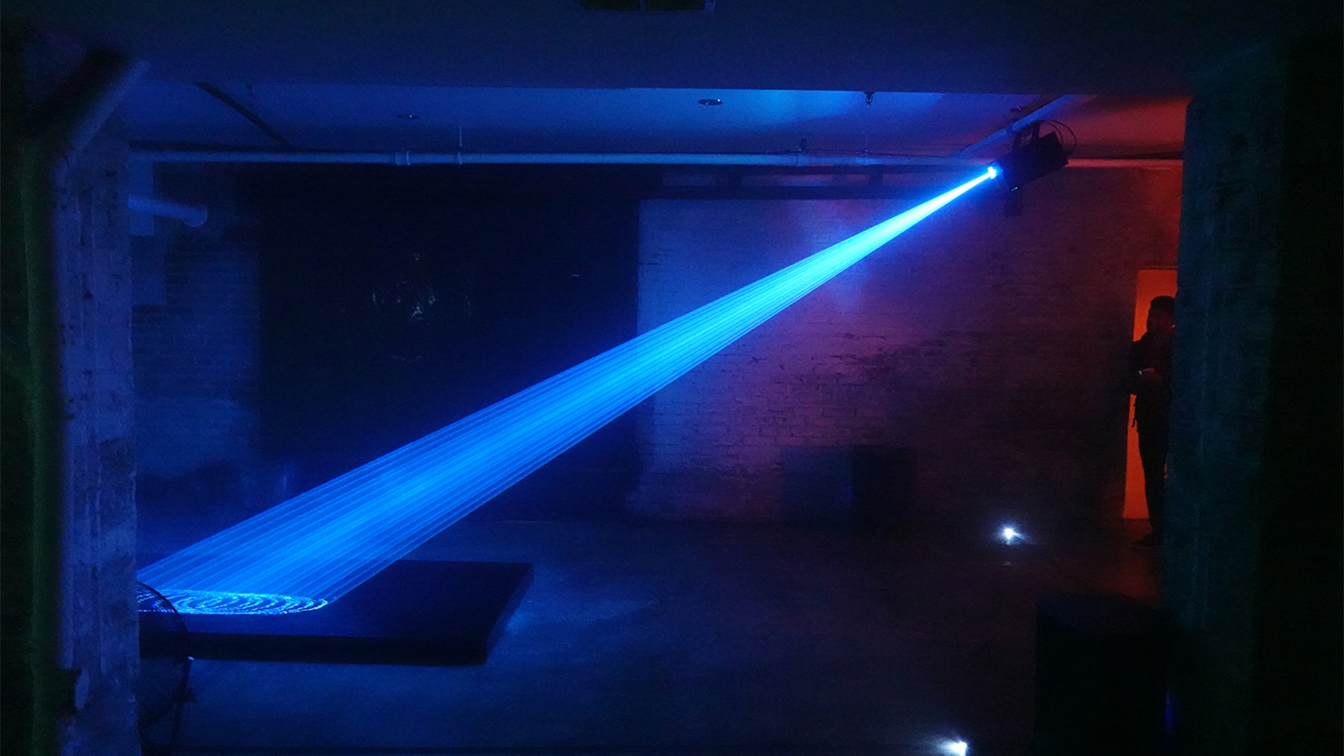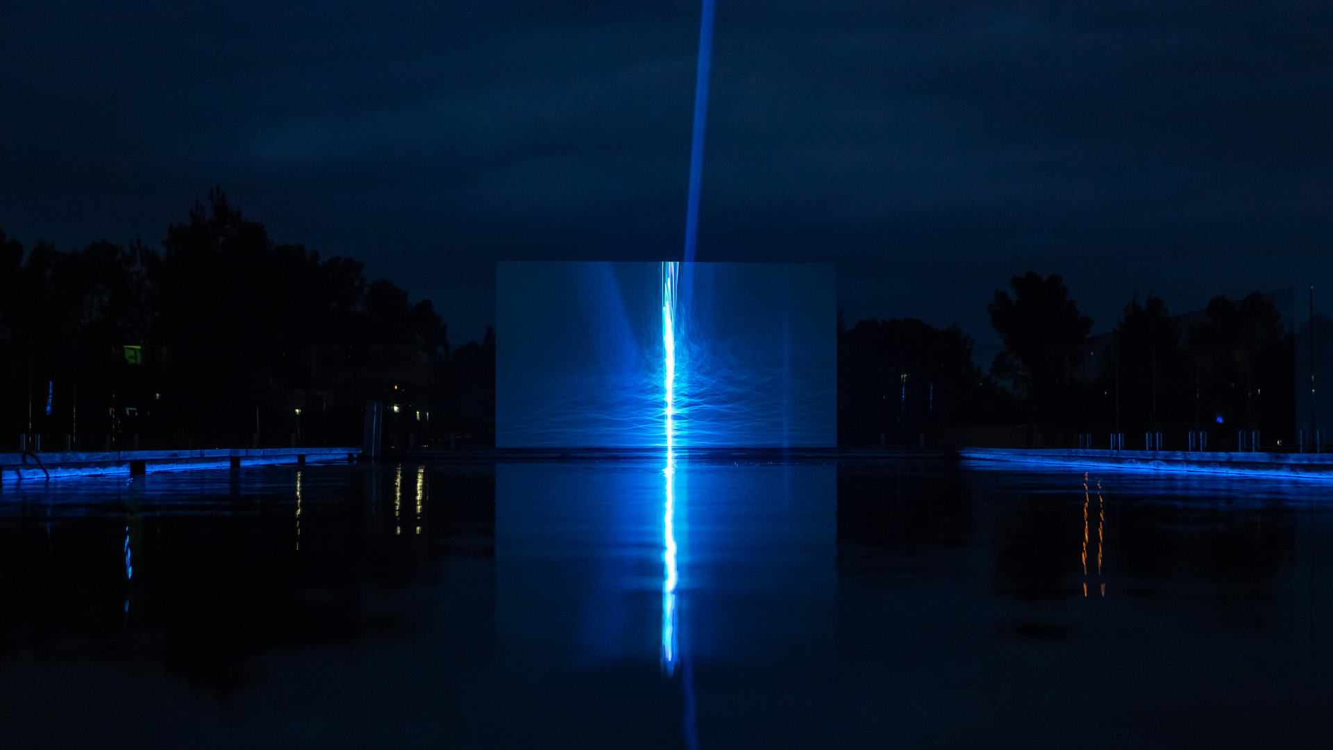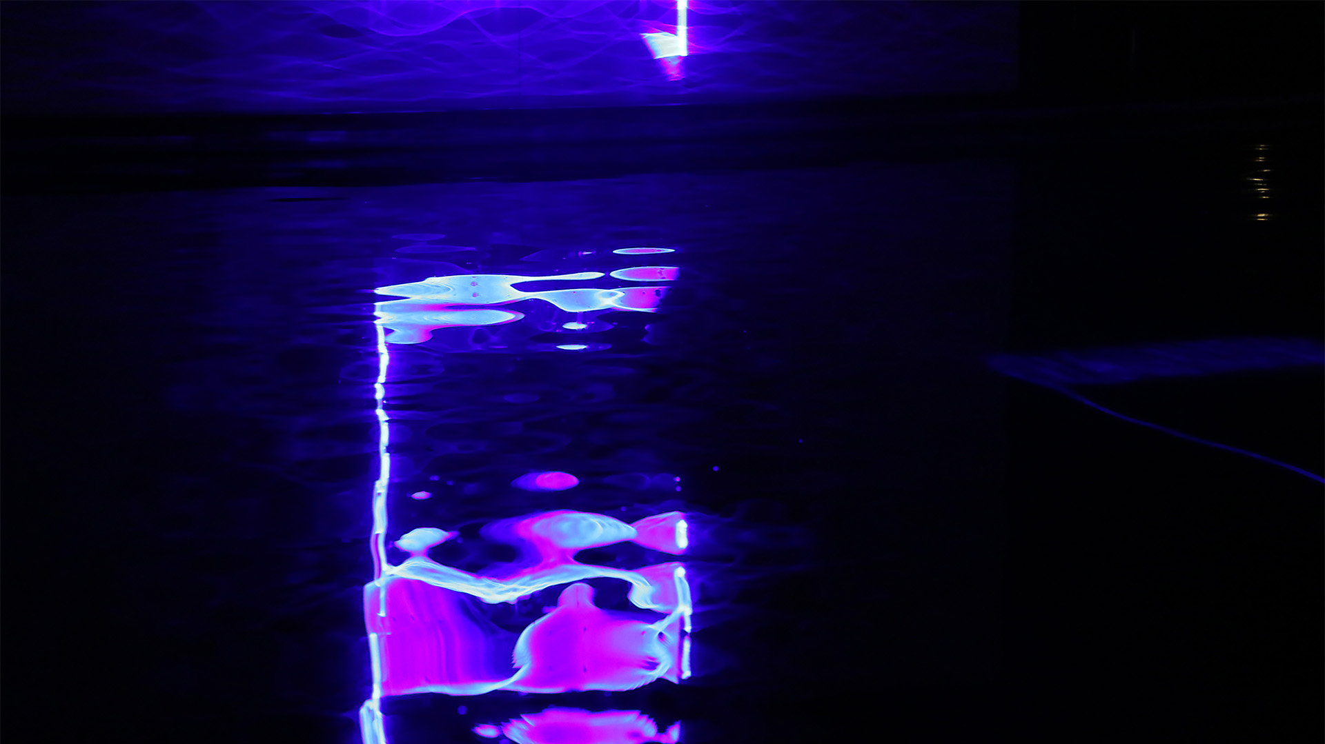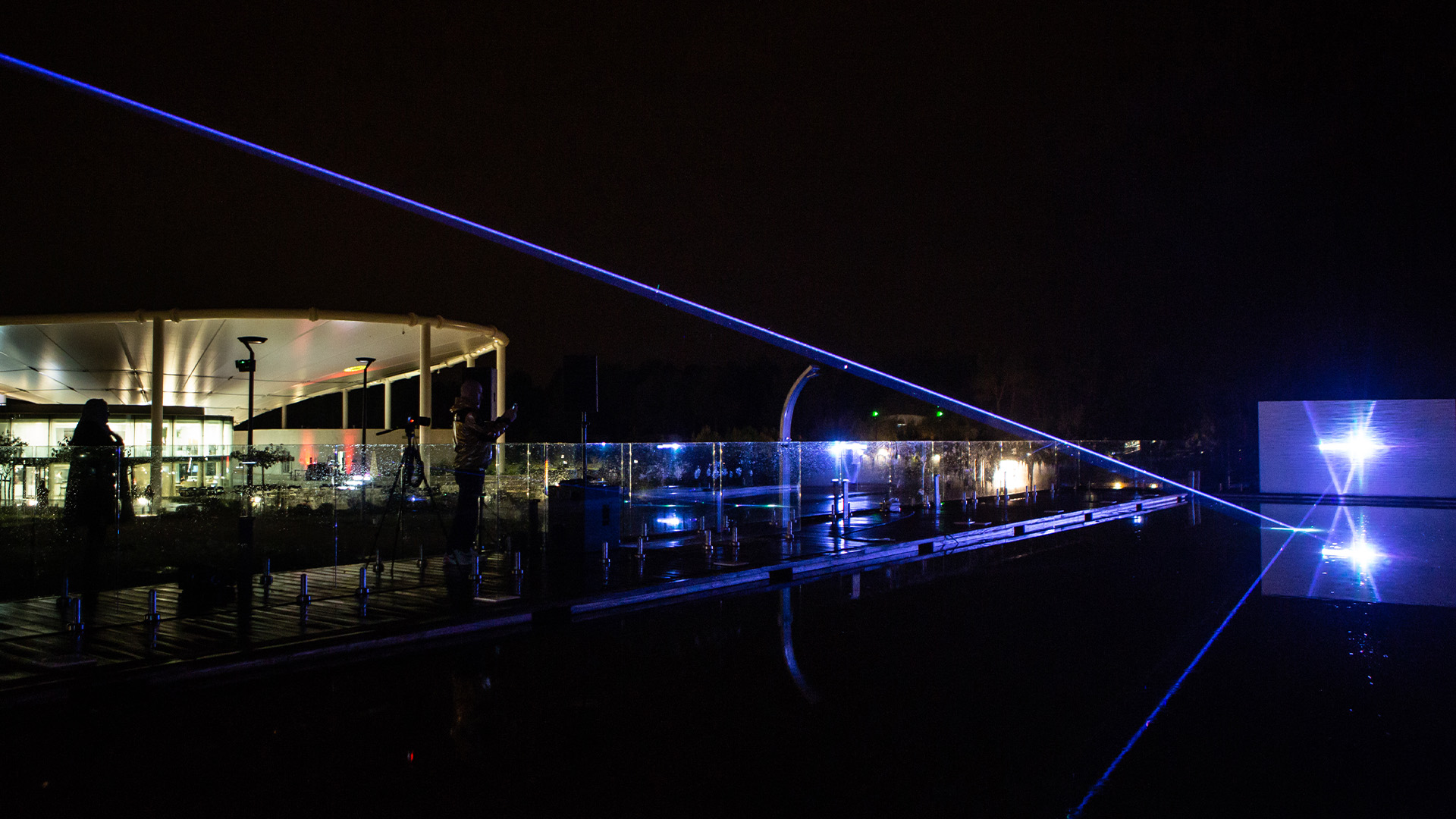 Created by the Montréal-based artists, "Laser Like Water" is a digital art installation intended as a meeting of various elements that together give rise to new perceptions of those same elements only possible as a result of their amalgamation. The piece is composed of brightly-colored lasers and shining ropes that slice through the air, fall apart upon contact with water, and then are reflected and deposited onto a mirrored screen. That ultimately results in the creation of new abstract forms, producing an intense experience - a connection and a synergy within a defined space.