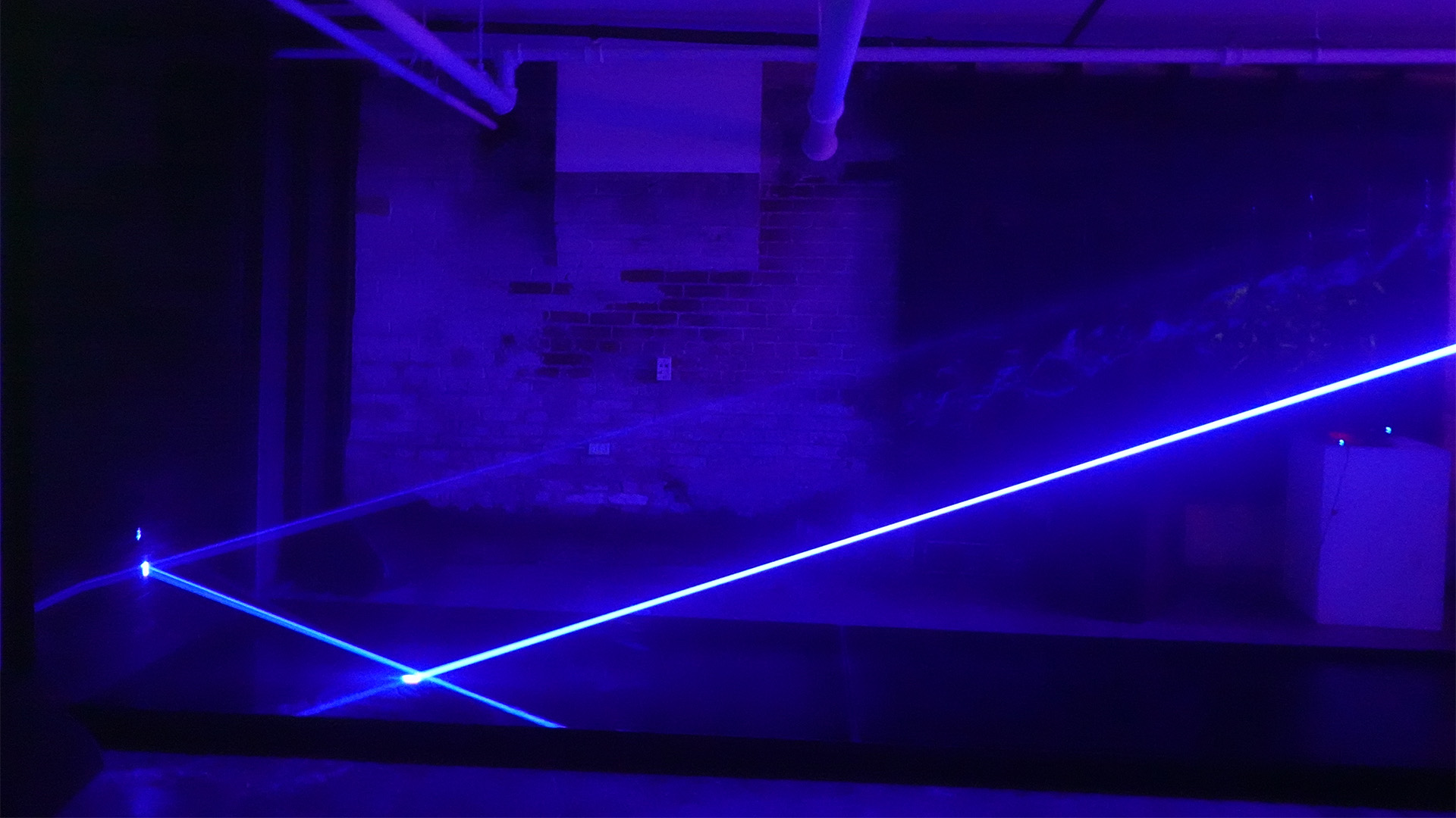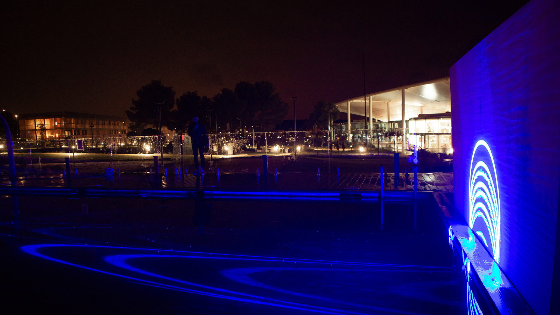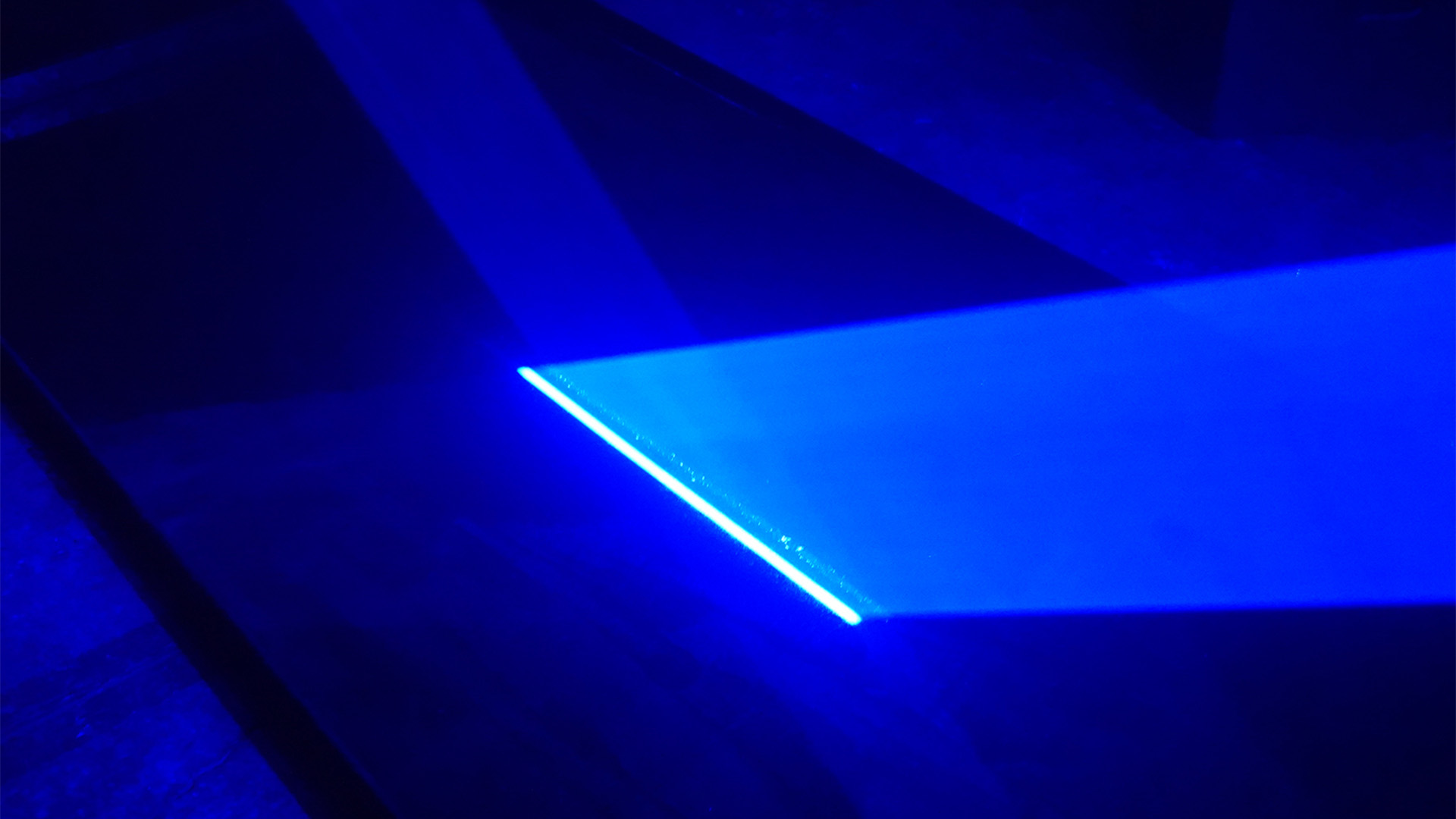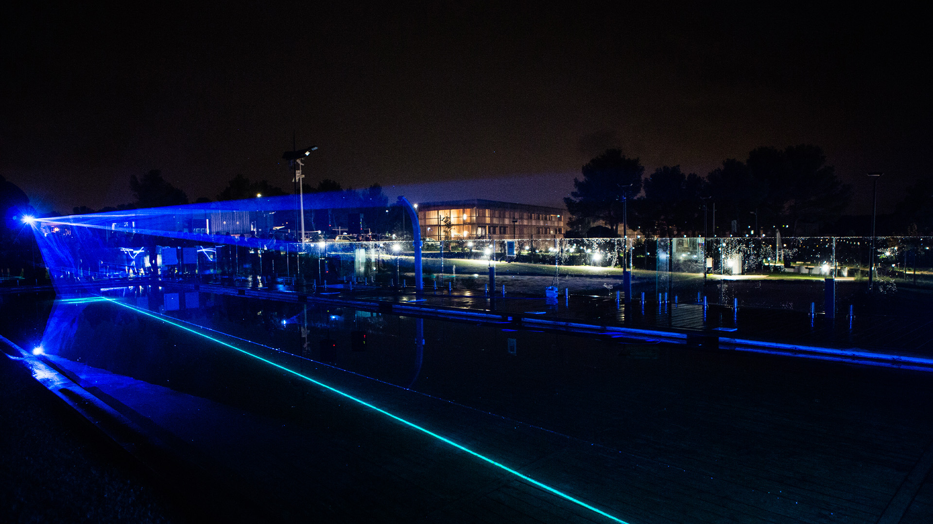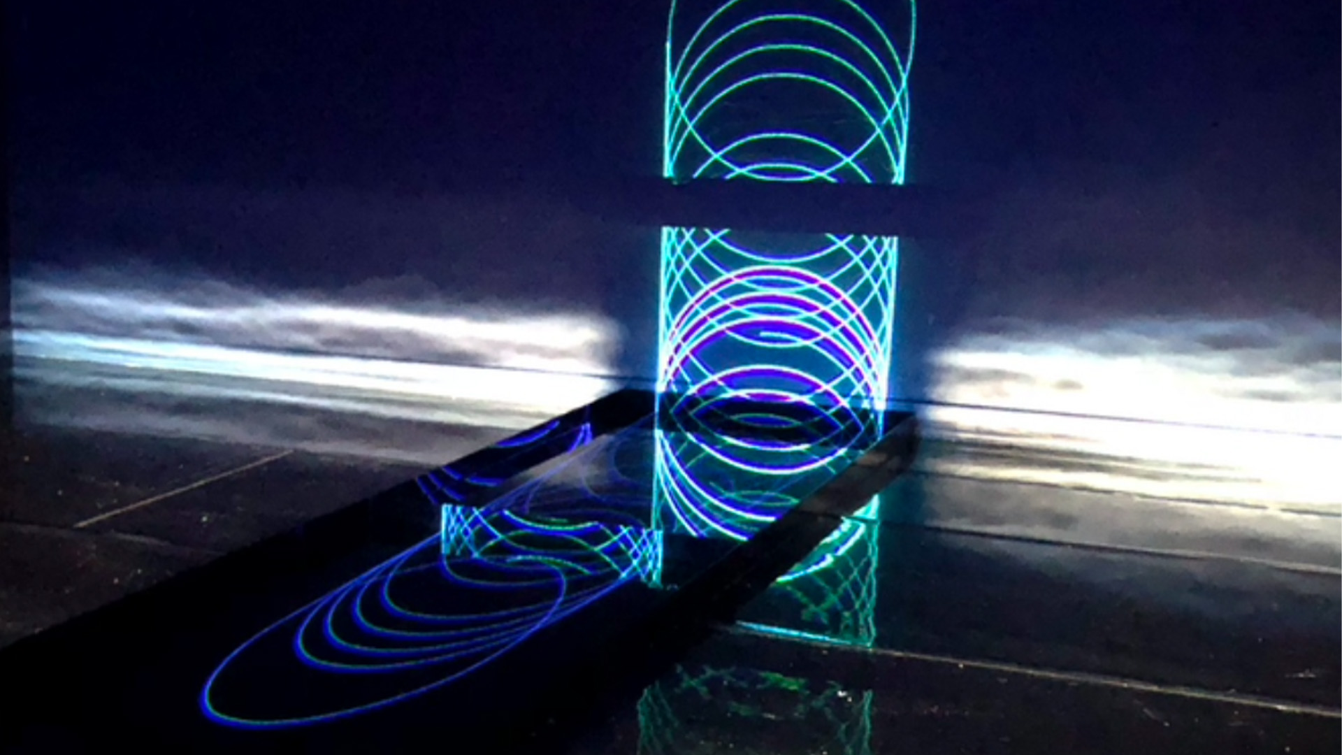 Created by the Montréal-based artists, "Laser Like Water" is a digital art installation intended as a meeting of various elements that together give rise to new perceptions of those same elements only possible as a result of their amalgamation. The piece is composed of brightly-colored lasers and shining ropes that slice through the air, fall apart upon contact with water, and then are reflected and deposited onto a mirrored screen. That ultimately results in the creation of new abstract forms, producing an intense experience - a connection and a synergy within a defined space.