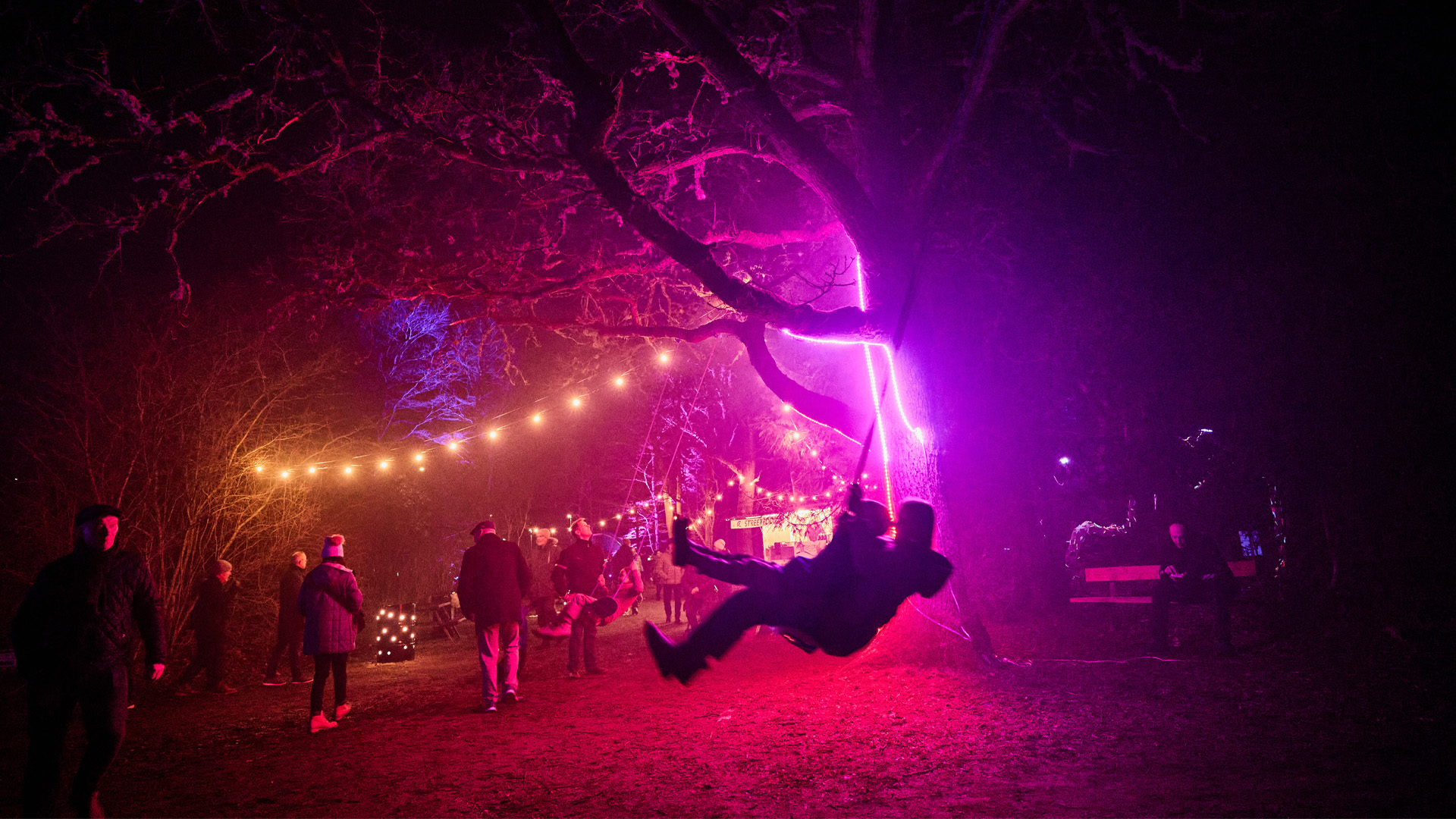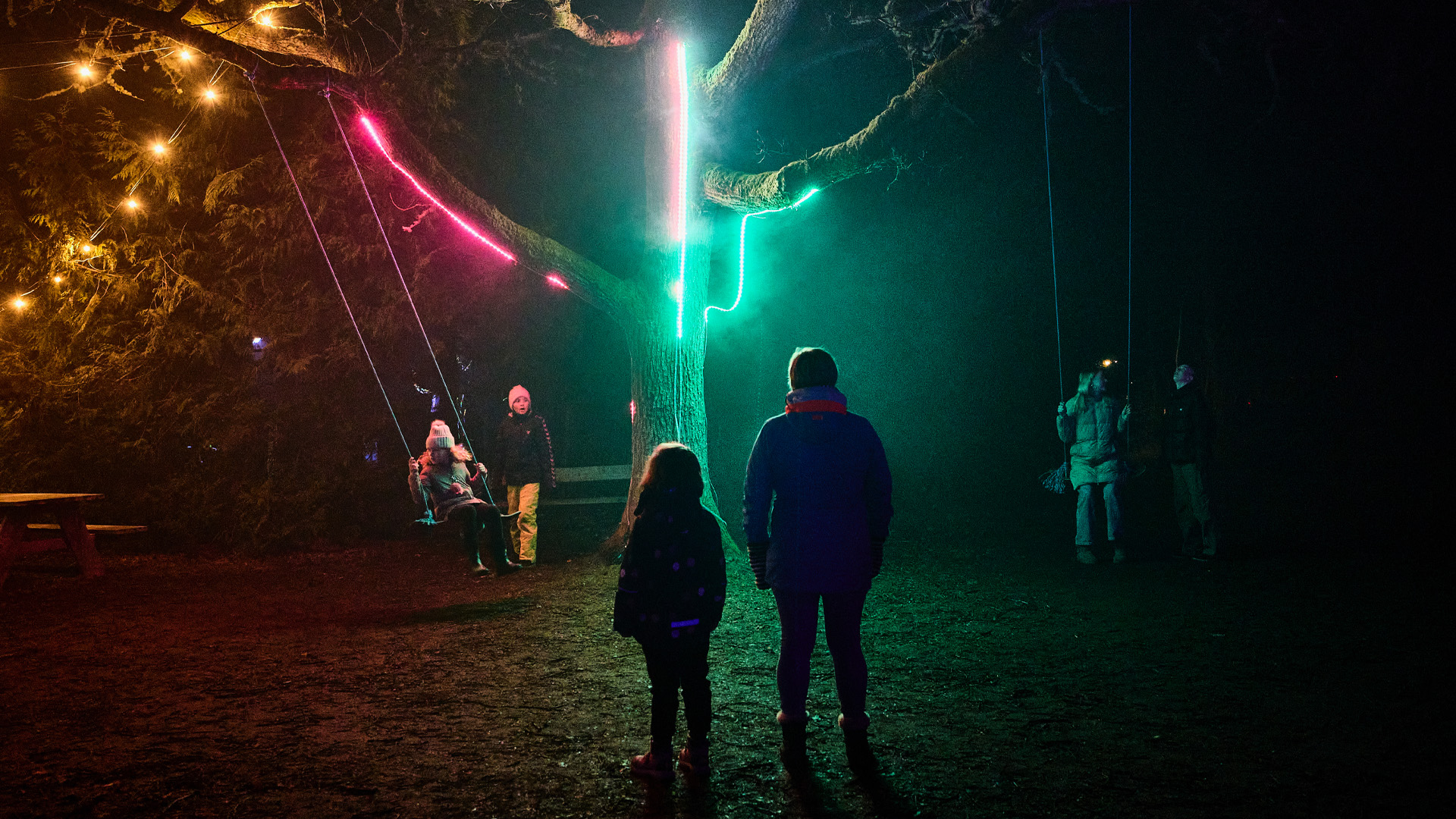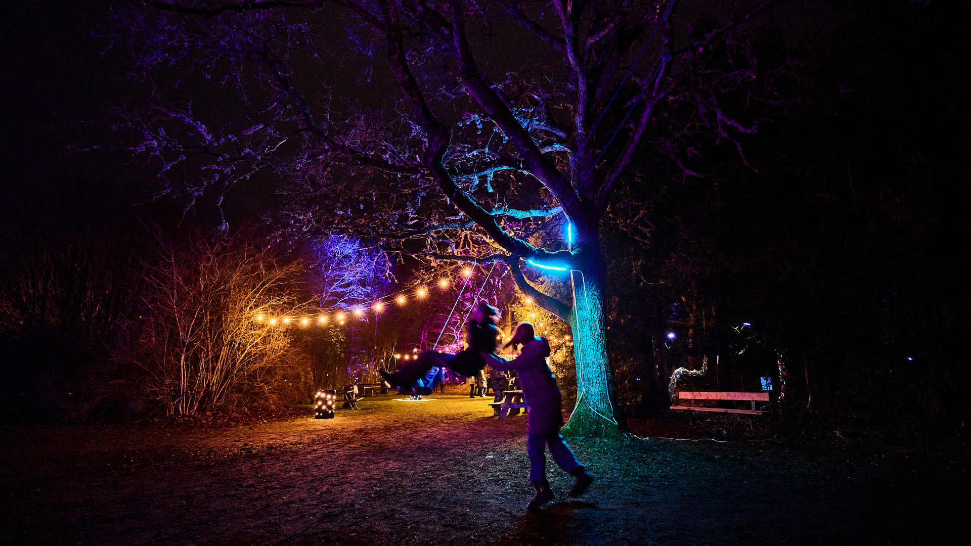 Two swings hang in a tree. With each kinetic swing rotation, a light flows up the tree until it’s full. Grow a Light - Grow a Tree is an interactive reinvention of the playground swing that brings an additional dimension of light and color to the experience. By encouraging people of all ages to connect and play and showing a glimpse of the future of the creative playground, the viewer sees himself in an immersive and mesmerizing experience.