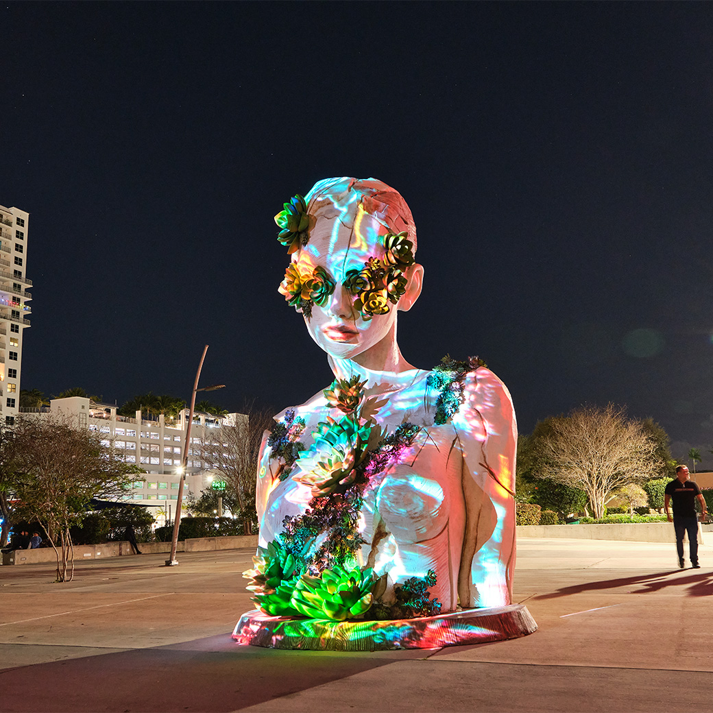 Daniel Popper's AEONIUM Prototype Sculpture is a striking 16-foot-tall creation that captures the resilience and beauty of the succulent it’s named after. During the day, the sculpture’s design draws inspiration from the spiral, rosette-shaped arrangement of Aeonium leaves, with large, thick, waxy forms that fan outward in shades of green, purple, and earthy hues. Known for his monumental, organic designs, Popper has crafted AEONIUM to evoke strength and serenity, inviting visitors to immerse themselves around its structure. As night falls, the sculpture undergoes a mesmerizing transformation through projection mapping. Carefully designed visuals are projected onto the surfaces, bringing the sculpture to life with moving patterns and shifting colors. This nightly projection mapping adds a dynamic, otherworldly layer to AEONIUM, enhancing its immersive quality and allowing the structure to become a living, evolving part of its surroundings. This interplay of light and form reinforces Aeonium’s celebration of nature’s resilience, creating an enchanting experience that captivates viewers in a new way each evening.