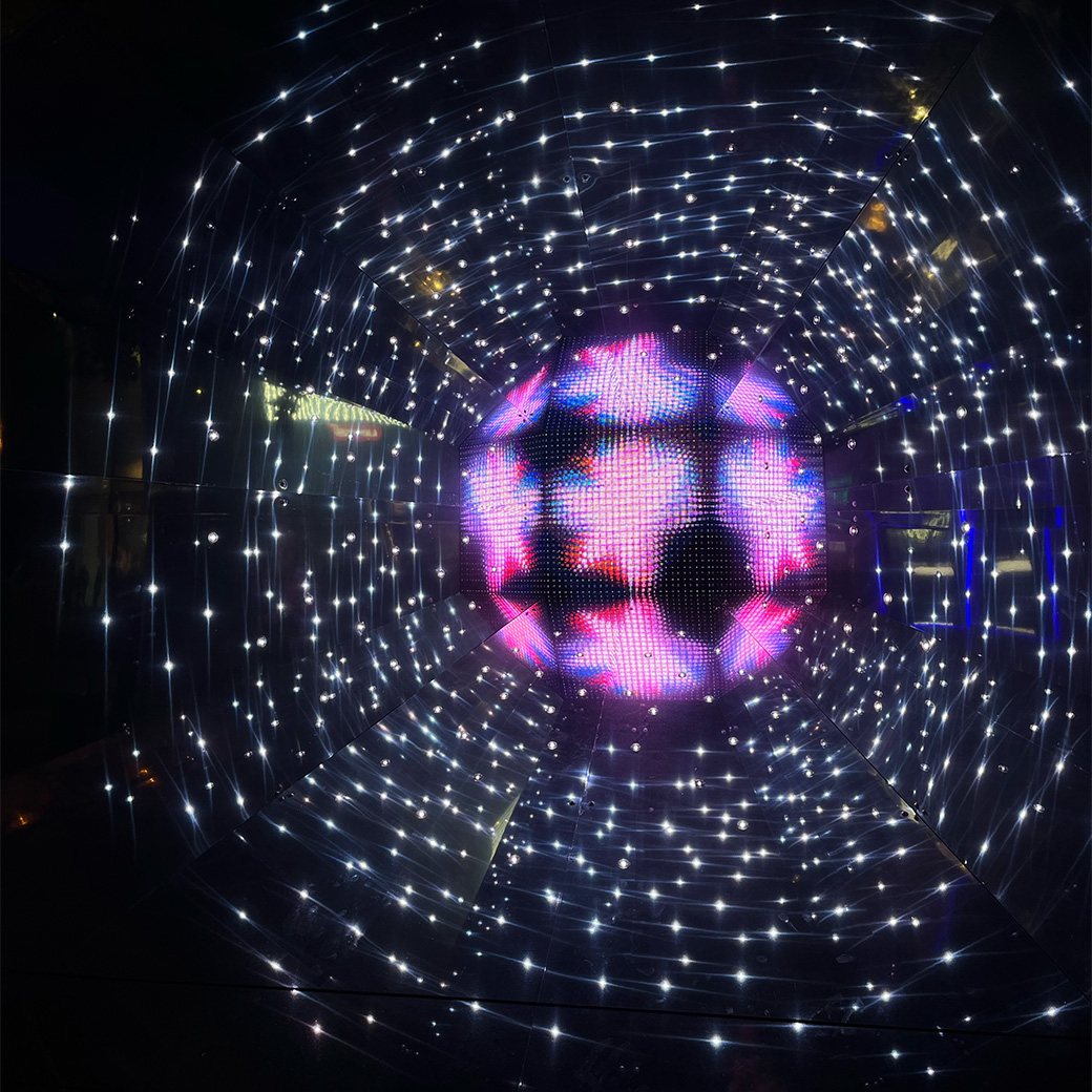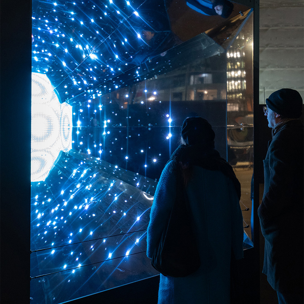Geist uses a mirror illusion to create a suspended spherical object of light, viewable 360 degrees around the sculpture. The sculpture itself is shaped like an octagonal carousel, 6m in diameter, each of its faces a 3x3m window into a figment of mirror and light. The illusion is interactive; only by the proximity and movement of the public does the suspended sphere of light come to life. Individually addressable LED modules start flickering and glimmering in the presence of people. The public is the cause of the artwork’s existence; their mass emits a response from the artwork: a version of ‘hide and seek.’