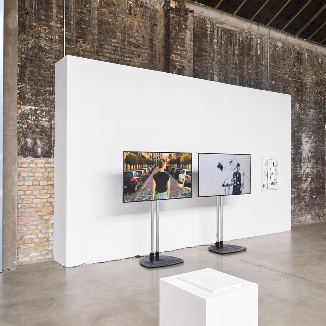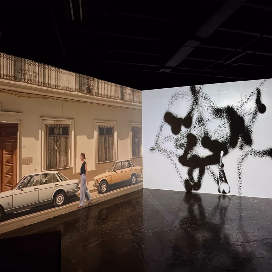 The second part of this multichannel installation consists of coded visuals, the result of a custom algorithm that reads Caballero’s body-in-motion and translates it into graphic marks, probing the connection between embodied experience and our attempts to record it.