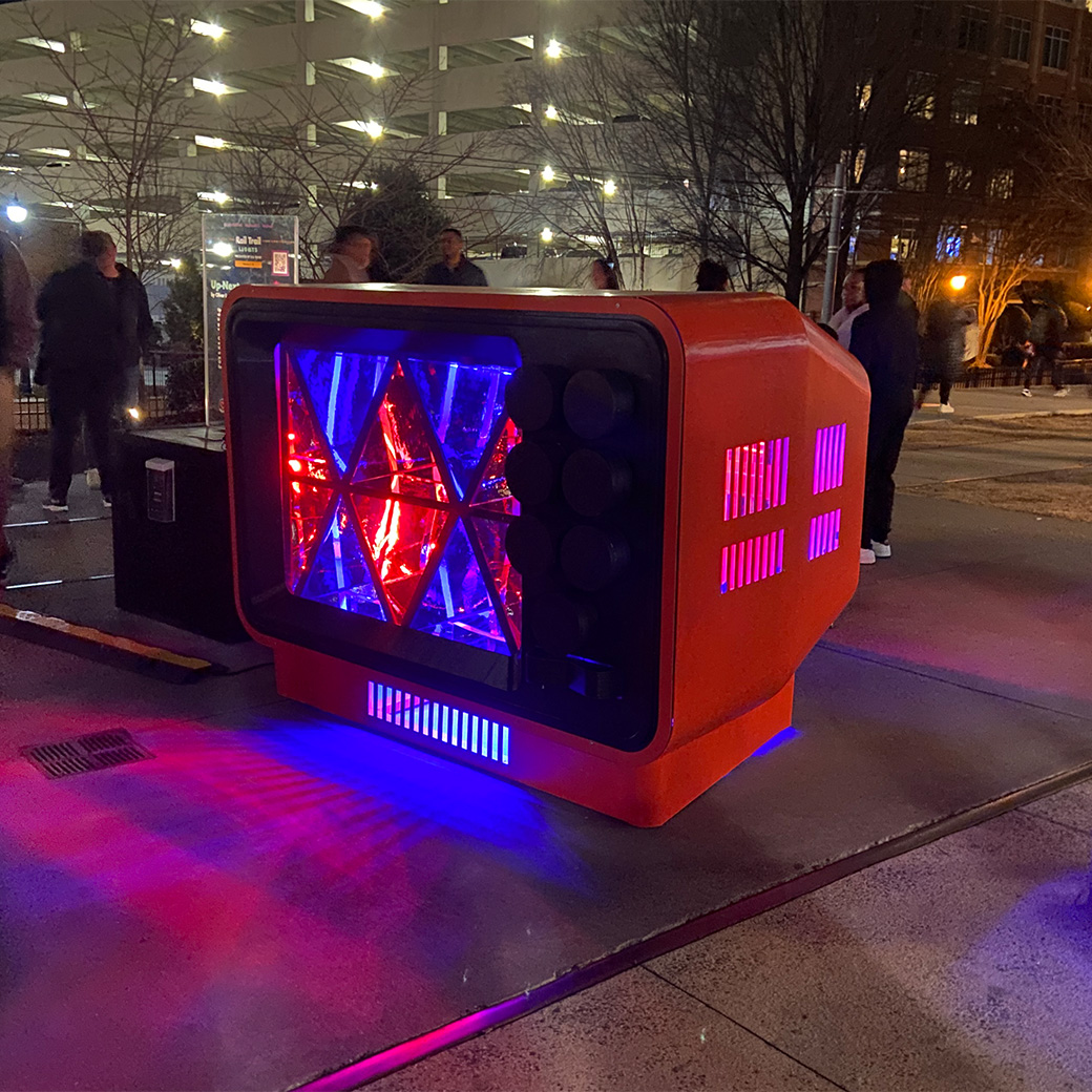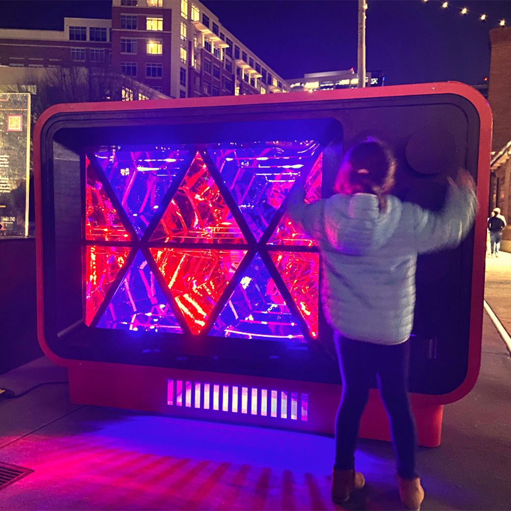 Up-Next is a participatory light-based sculpture that reimagines a classic 1980s television set as a portal for playful convergence. At its core, a series of kaleidoscopic visual chambers respond in real-time to user input. Visitors are invited to turn large retro-style knobs, just like channel surfing in the analog days, to control color schemes, kaleidoscope patterns, and animation speeds. This physical interaction creates a personalized sensory experience that blends nostalgia with dynamic, future-forward light art.