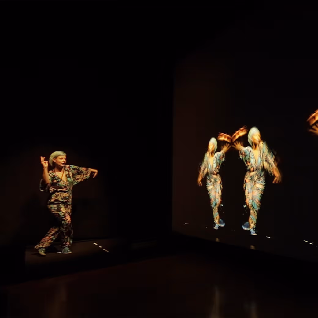 This interactive dance installation features a contemporary magic mirror where participants dance with repeated, time-shifted versions of themselves through real-time effects.