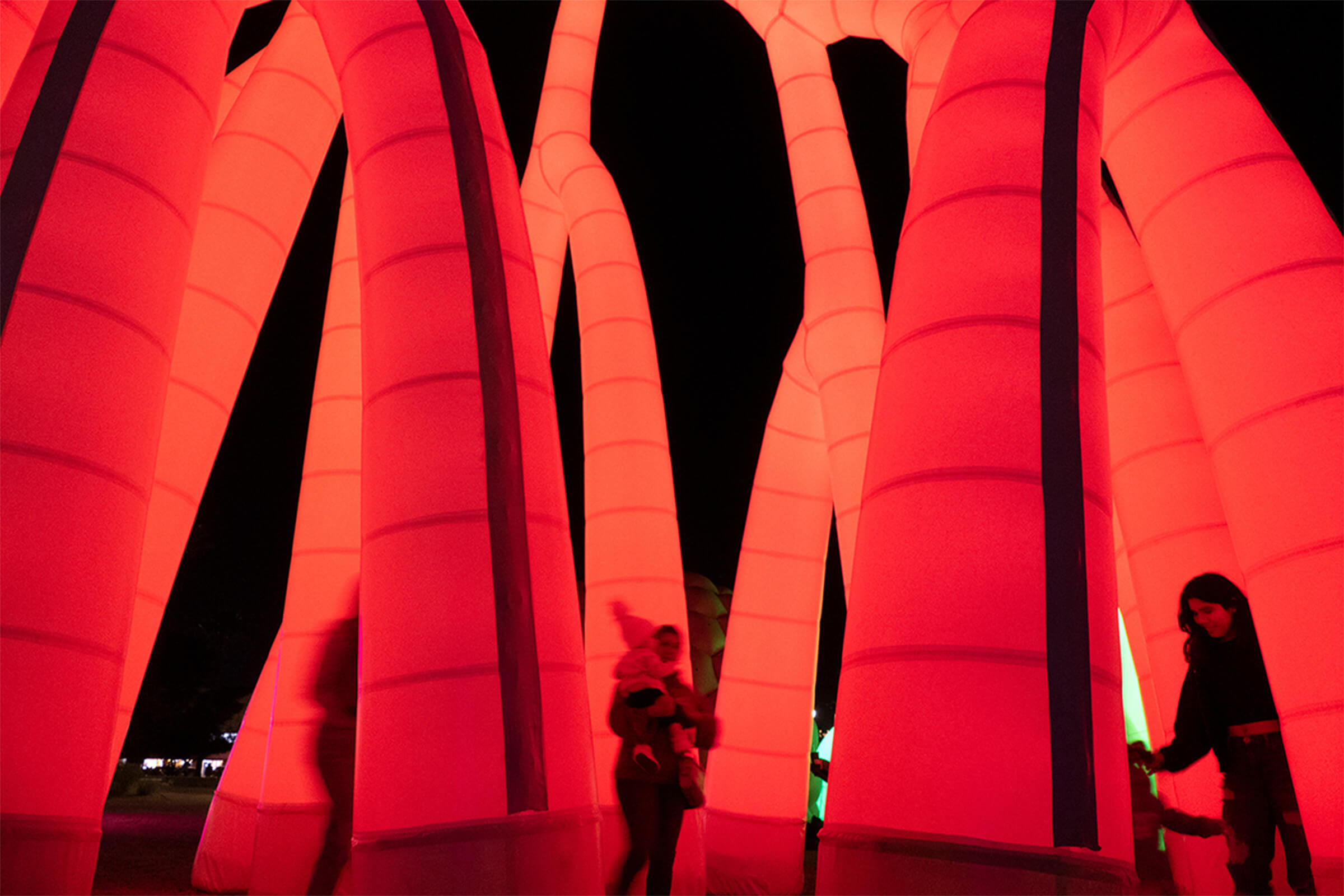 Grove is an immersive sculptural environment that unveils the invisible world beneath our feet. It takes inspiration from the subterranean root systems that connect the trees in our forests, allowing them to communicate and share nutrients with one another. Here, twenty-three columns of light are channeled into a single branching network vaulted high into the sky. Light and ever-shifting washes of color pulse through the arches, creating a cathedral-like space below ripe for exploration. Grove is a space for community gathering and play that monumentalizes the vibrancy of interconnectivity.