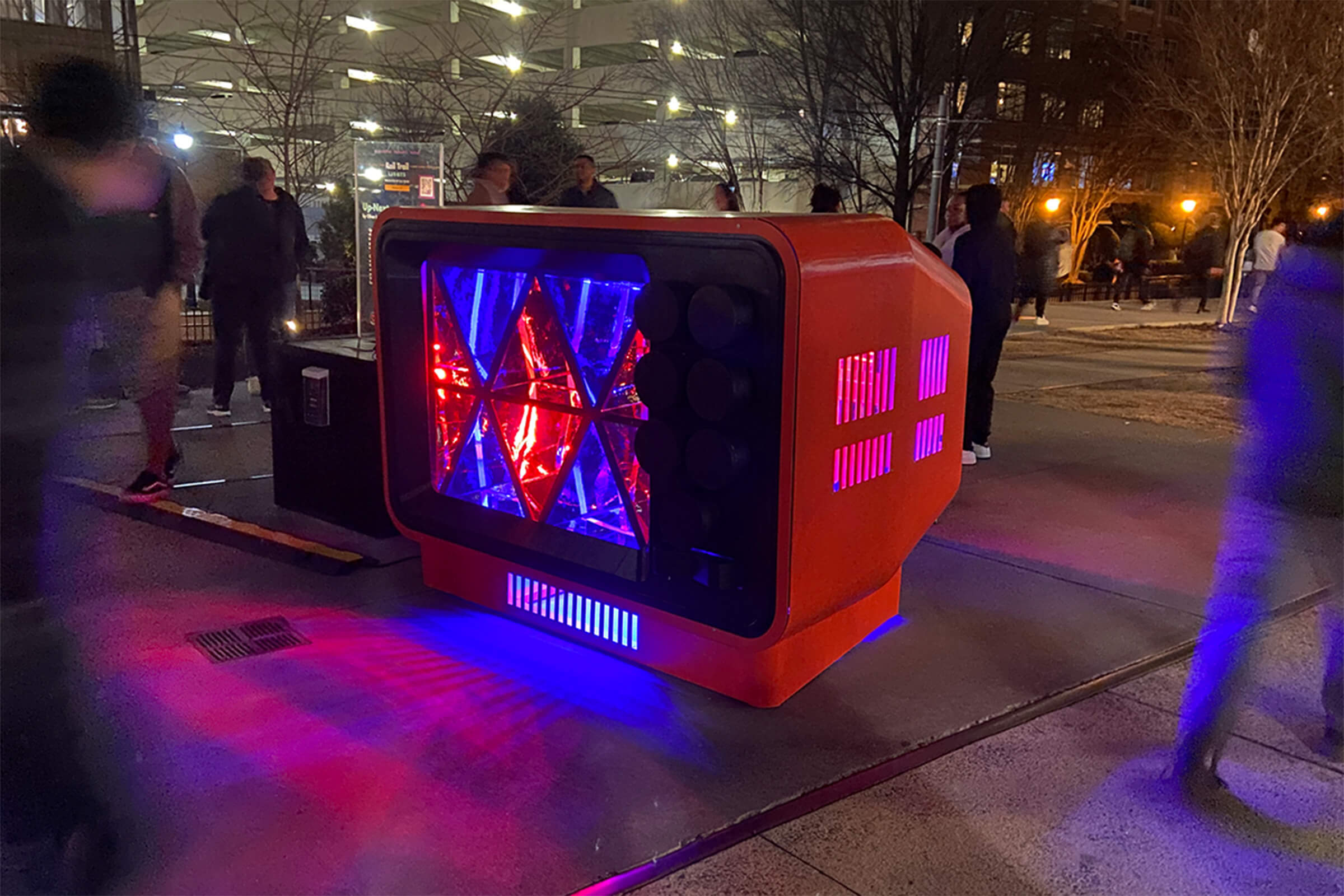 Up-Next is a participatory light-based sculpture that reimagines a classic 1980s television set as a portal for playful convergence. At its core, a series of kaleidoscopic visual chambers respond in real-time to user input. Visitors are invited to turn large retro-style knobs, just like channel surfing in the analog days, to control color schemes, kaleidoscope patterns, and animation speeds. This physical interaction creates a personalized sensory experience that blends nostalgia with dynamic, future-forward light art.